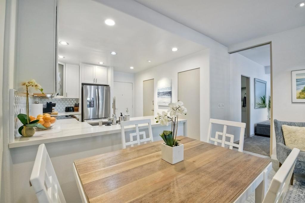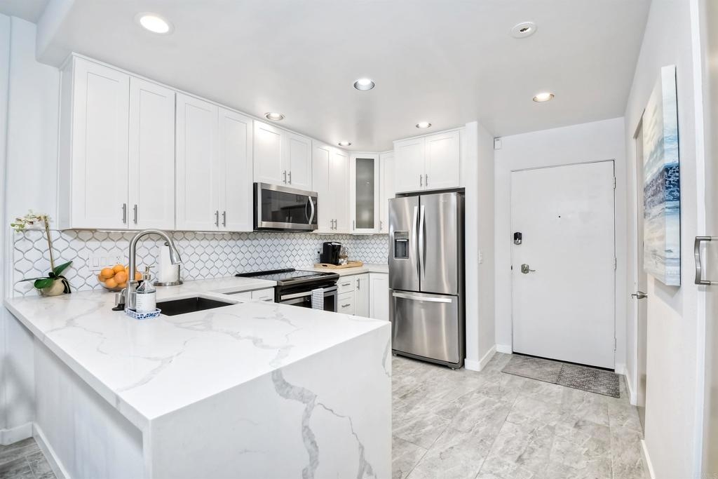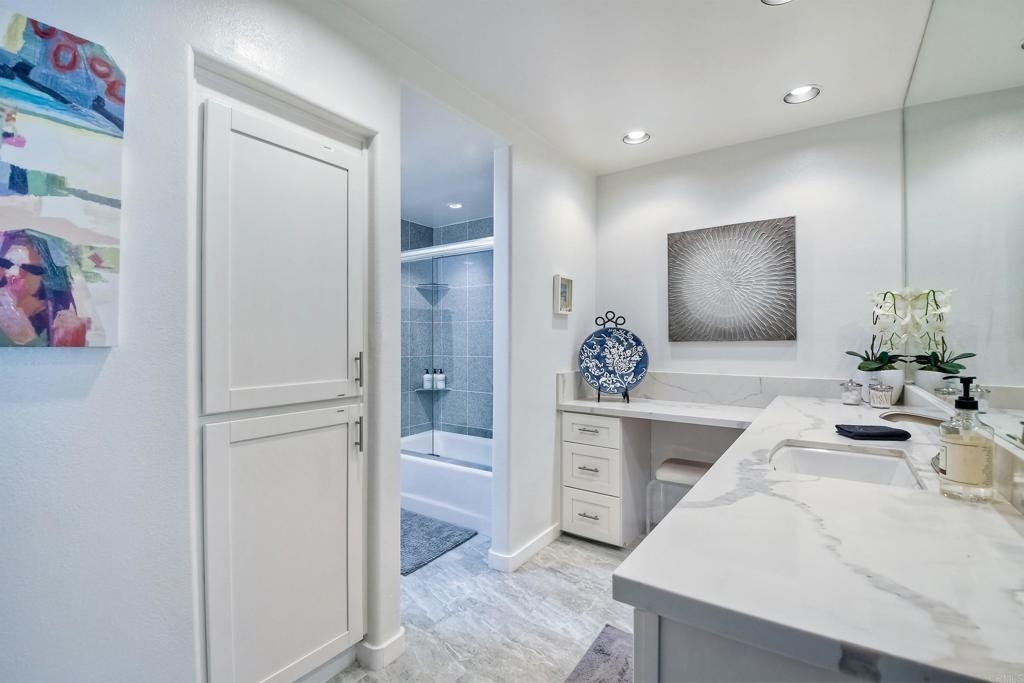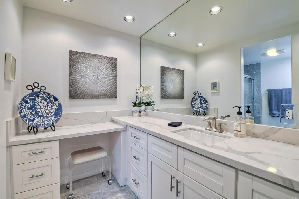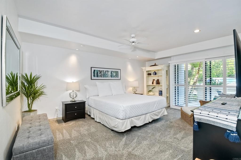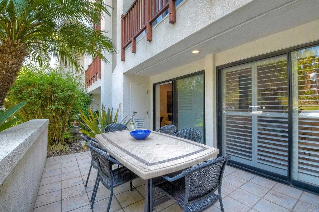 Resort-style living at La Costa. Gorgeously renovated first floor condo with sparking white kitchen with quartz waterfall countertops, stainless steel appliances and huge sliders that open to a private patio for the ultimate in indoor/outdoor living. Oversized bedroom has ensuite bath complete with quartz counters, tub/shower combination and access to the private patio. Wide plantation shutters on both sets of sliding glass doors. The Balboa Building has it's own pool, BBQ area, lawns, and secure assigned underground parking...as well as combo secured entrance into the building. This unit is on the side of the building that allows for barrier-free access to the unit by way of the elevator in the garage...no steps! There is also a laundry room within the unit which also serves as the locked Owners Closet when short term rental guests are there. This first floor unit is one of only 8 in the building with a private patio and it's on the "quiet" side of the building...not on the "pickle ball courts" side. The Omni Resort is adjacent with two 18 hole golf courses and tennis available for those who want to buy a membership. Golf, sport and social memberships are available. The restaurants, spa and shopping are available to the public. This is a terrific investment opportunity as Short Term Rentals are allowed in this building by the HOA and the City of Carlsbad. This unit has years of 5 Star ratings on VRBO, Airbnb, etc and the Short Term Rental Property Manager comes highly recommended. Bookings can be transferred over if desired. Rental history is available. The Omni has a vibrant conference schedule of events and in addition the resort will be hosting the 2024-2026 NCAA D-1 golf men's and women's championships. Short drive to fabulous Carlsbad and Encinitas beaches, tons of great shopping and you'll never run out of new restaurants to try.