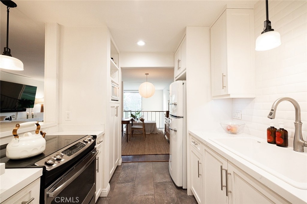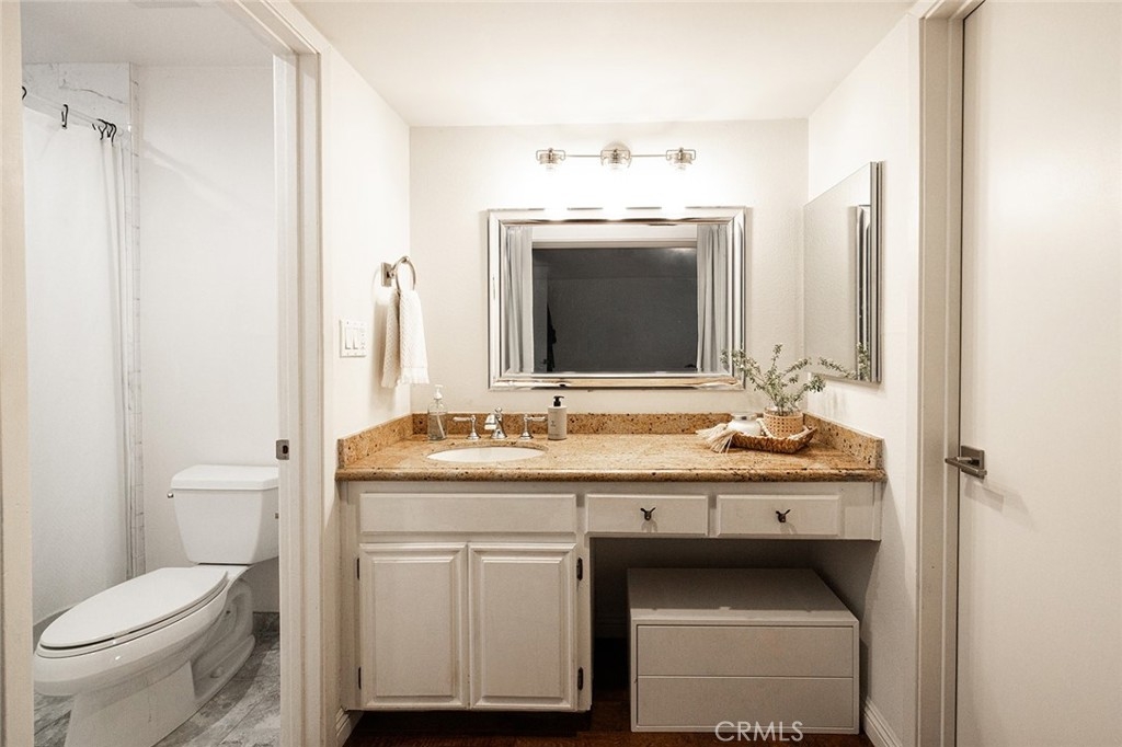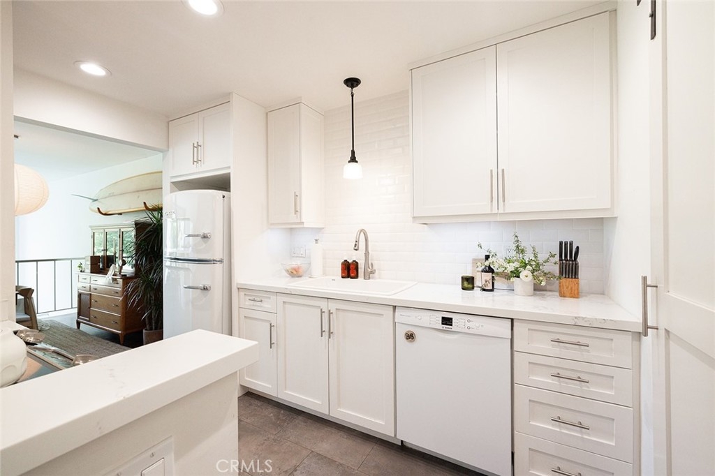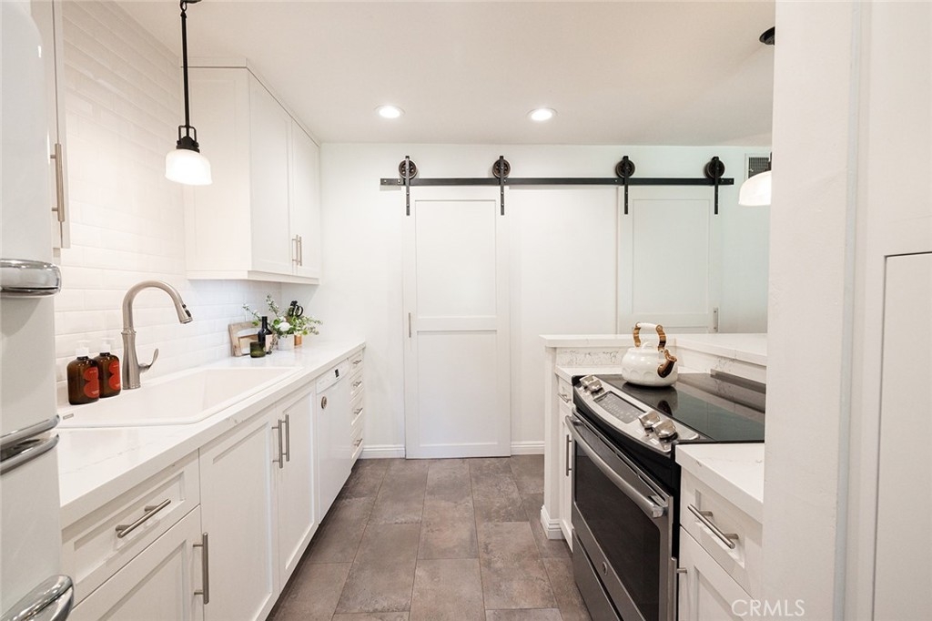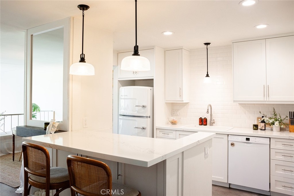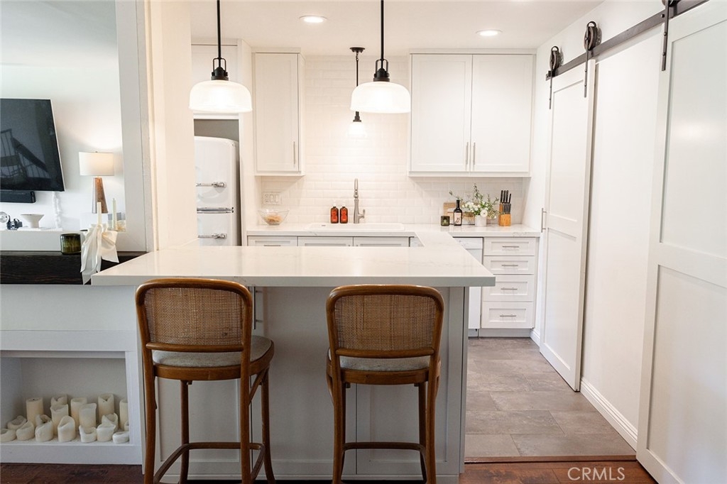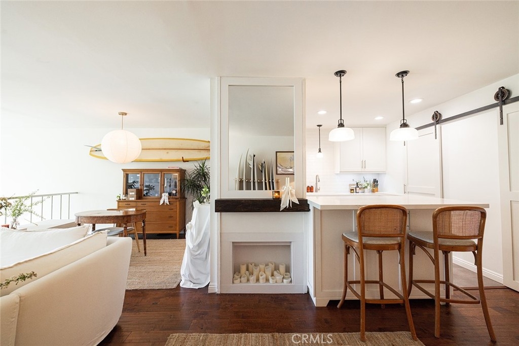 Discover the epitome of elegance in this stunning meticulously remodeled La Costa Cay home blending modern luxury with timeless charm. Floor to ceiling wall of oversized windows and sliding door create breathtaking golf course views. Step inside to an expansive open-concept living space, where new windows and an oversized slider flood the area with natural light, enhancing the exquisite wood floors that extend throughout. The kitchen is a masterpiece of design, featuring a quartz island and countertops, a stylish farm basin sink, charming vintage look refrigerator, Bosch dishwasher, electric range, sliding barn doors to pantry closet and curated lighting that highlights every detail. Large living area is currently configured with dining area in front of the kitchen island, living area with 75” included TV and convenient office space with striking sphere chandelier. Retreat to the primary bedroom offering serene comfort with new dual pane windows, plantation shutters and enhanced organization with custom closet systems. The ensuite bathroom is adorned with granite countertops and a sophisticated marble-look tiled primary shower/tub surround as well as marble look tile floors, adding a touch of spa-like luxury. Wood floors continue as you head downstairs to the 2nd bedroom space that is a great option for a gym or an office. Large closet, coffee/ wet bar and in unit laundry are on this level. This residence is equipped with all the modern conveniences, including central air conditioning, motorized shades on large windows, scraped ceilings, and new dual pane windows showcasing the tranquil views of the trees and golf course from your private balcony. Relax in your own oasis or in the community pool, hot tub and sauna. Additional amenities include a gated entry with keypad, convenient building elevator, covered garage with your reserved space, open guest parking, and included trash and water. Embrace a beach close coastal lifestyle of tranquility and elegance in this exquisite Carlsbad home, where every detail is crafted to perfection. Conveniently located 15 min from the beach and Batiquitos Lagoon, and nearby restaurants and shopping at multiple centers including The Beacon at La Costa. Welcome Home!