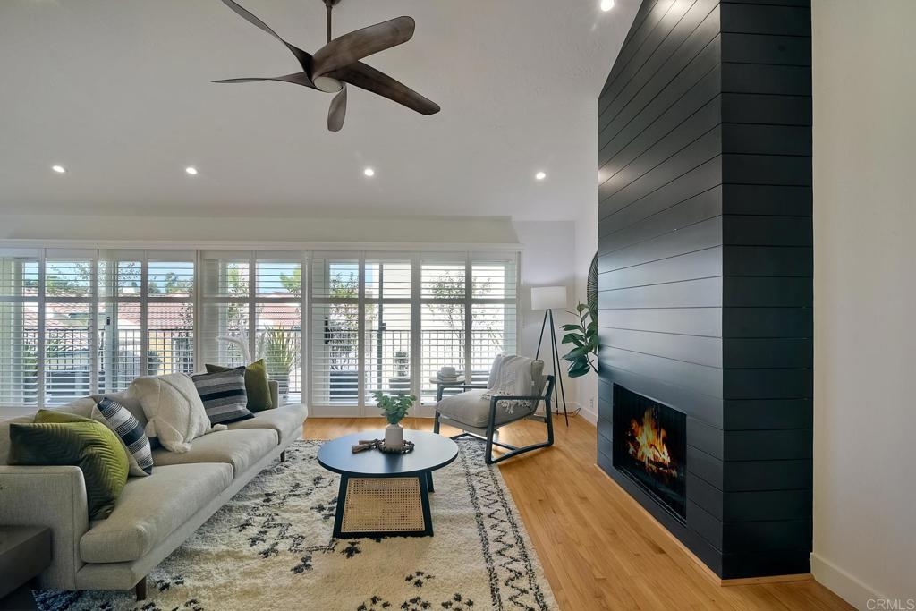 CHIC LA COSTA TOWNHOME!! You will not want to miss the sophisticated style of this supremely located corner unit in La Costa del Sol. Sunshine pours in through the plentiful upgraded sliders and windows to highlight the beautifully refinished blonde hardwood floors. The main living area is open and bright with vaulted ceilings w/ added LED lighting, fresh paint, sliding shutters, a large custom window off of the dining area looking out to the hills of La Costa, and a re-designed custom floor to ceiling black ship lap fireplace. The spacious kitchen offers granite counter tops, gas cooking, stone tile floors, built-in fridge, and a new stainless steel dishwasher. Both bedrooms are located on the lower level with sliders to the private rear patio. The large master suite has double closets, and opens up to the bathroom with a huge soaking tub, walk-in shower both finished with rich emerald green stone. The bathrooms are adorned with new stylish gold fixtures and lighting. The oversized 2 car attached garage has an upgraded tankless water heater, 220 Sq Ft loft space, newer furnace, and a 440 bottle temperature controlled wine storage. This home has a newer AC unit that was relocated to the back, and also has a whole house fan. This lovely community is studded with beautiful pavers and and a re-designed common area that offers a gorgeous space to relax and gather to enjoy the wonderful costal climate.
