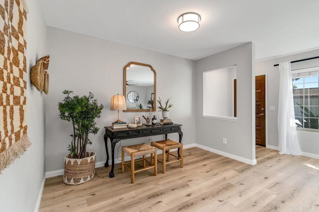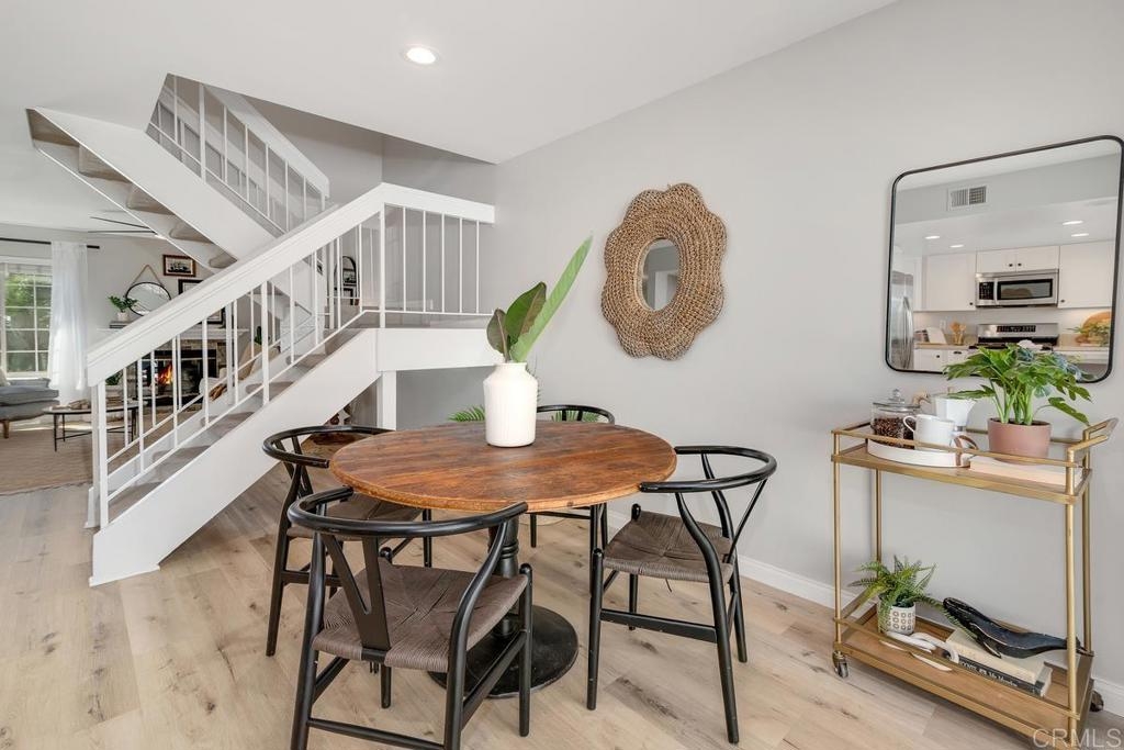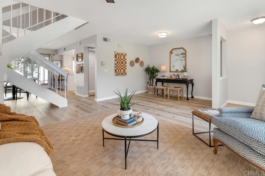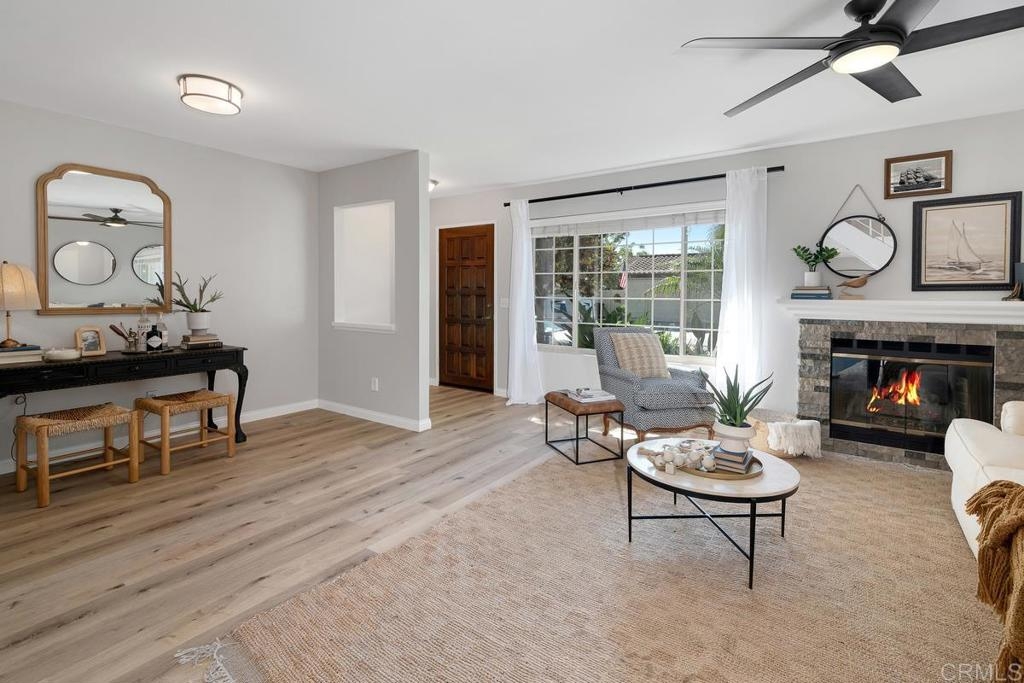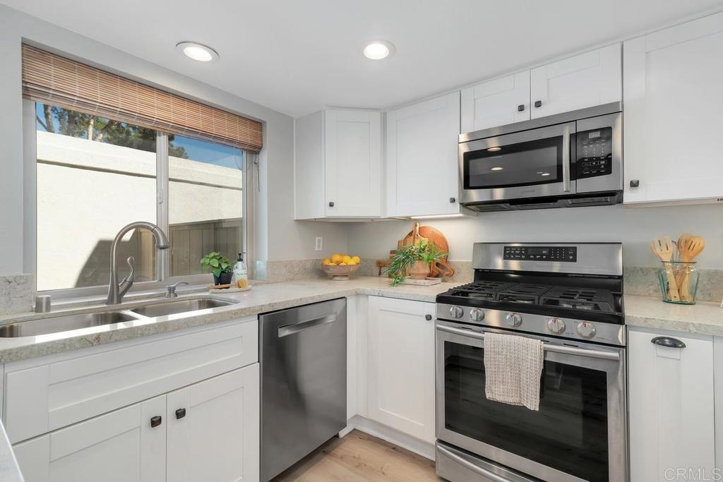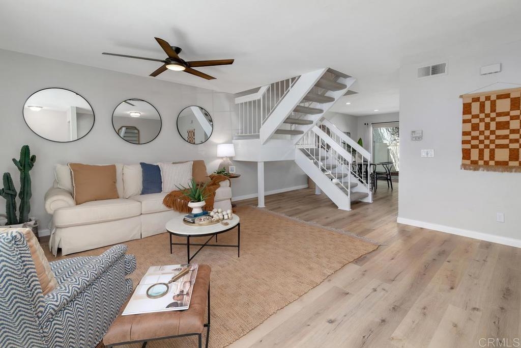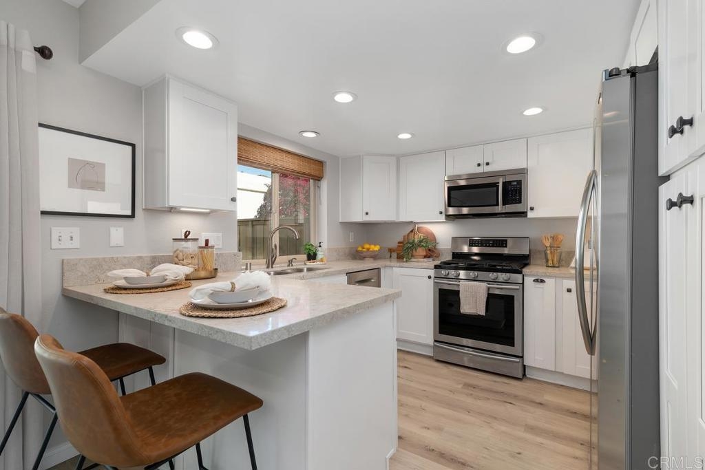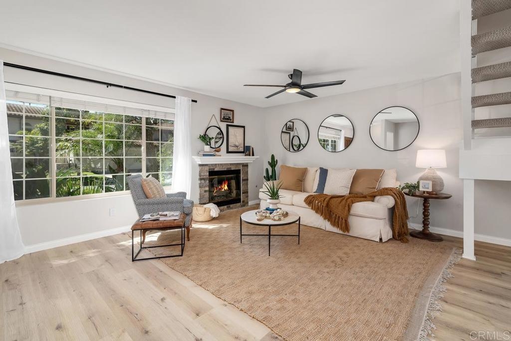 Picture-perfect townhome in Carlsbad’s Las Playas community, offering breezy coastal charm and sunset views. This west-facing retreat, tucked away from traffic, boasts a remodeled kitchen with shaker cabinetry, stainless steel appliances, gas range, and microwave, plus three updated bathrooms and light oak LVP flooring throughout. Spacious primary suite with walk-in closet and modern bath with walk-in shower. Cozy living room with fireplace and updated ceiling fan. Large secondary bedrooms. Private patio yard & detached garage. Enjoy community pool, tennis and hot tub. Walk to Pacific Rim Elementary, Poinsettia Park, Batiquitos trails, beaches, and more.