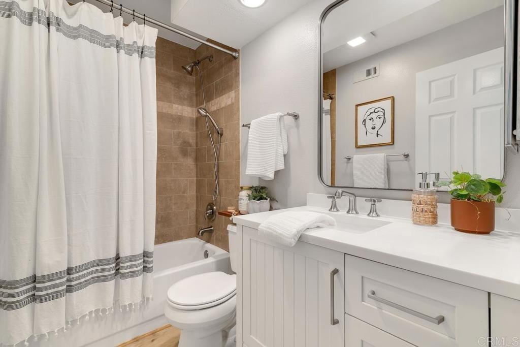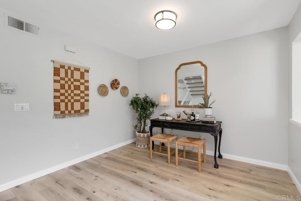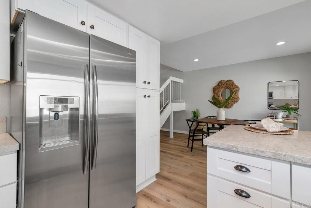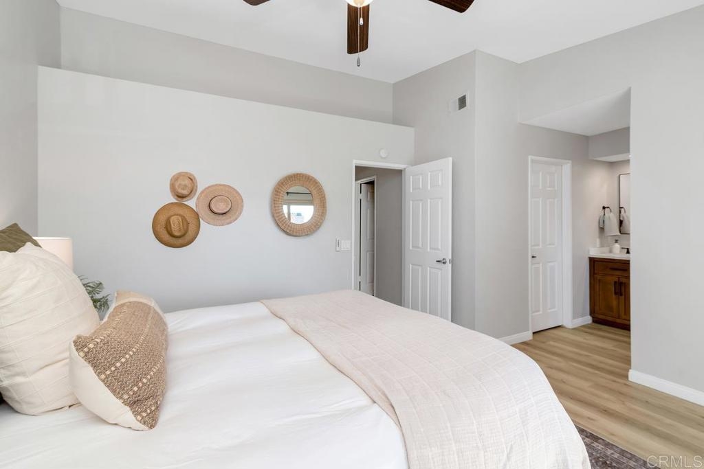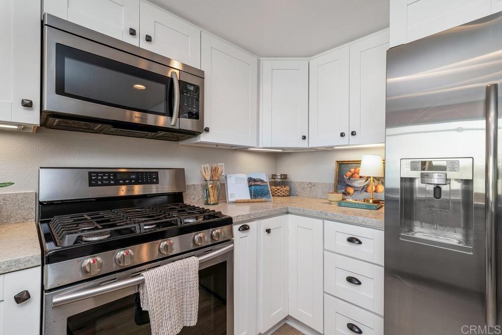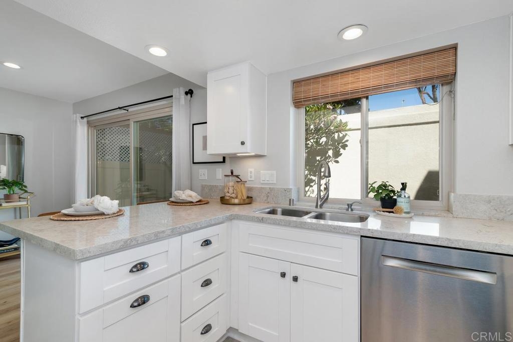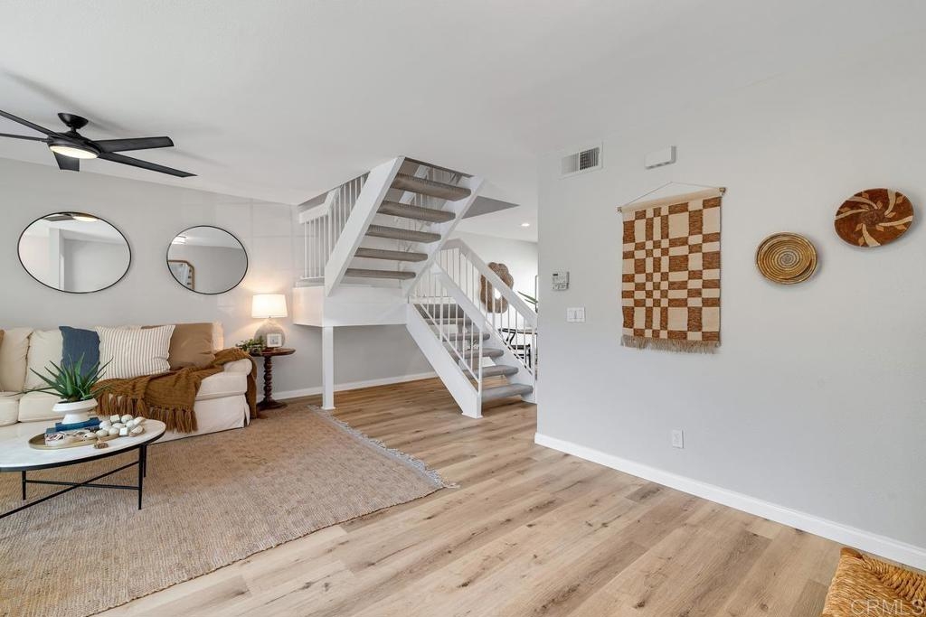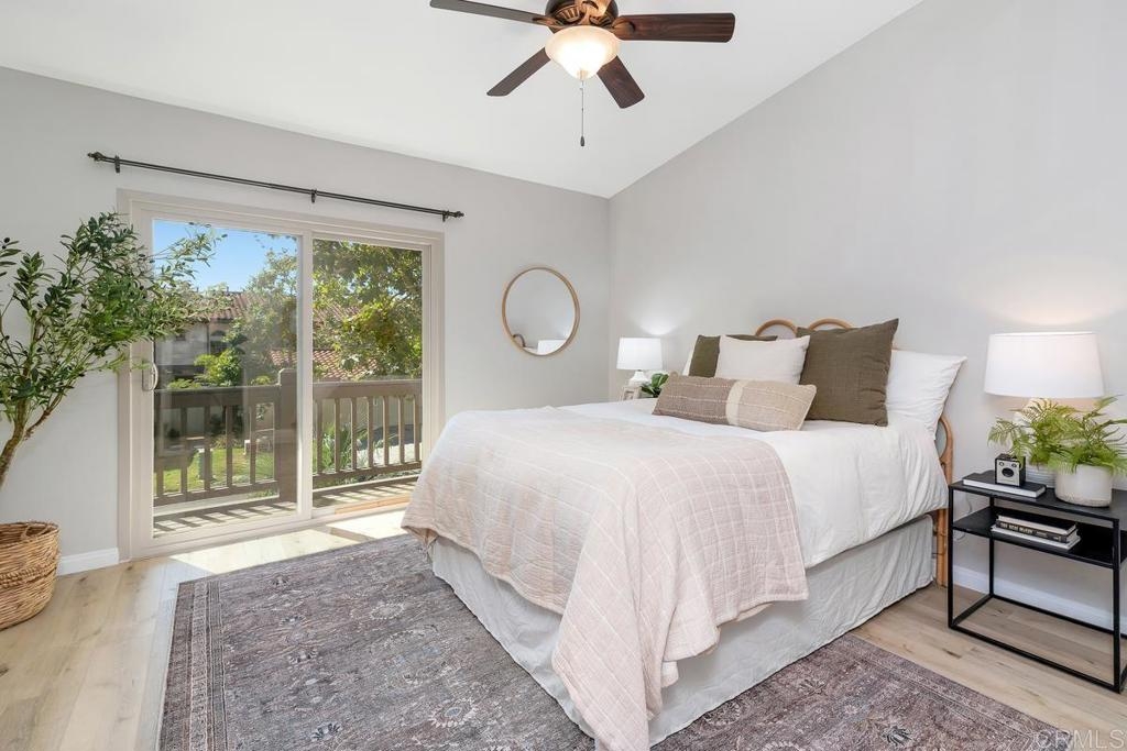 Picture-perfect townhome in Carlsbad’s Las Playas community, offering breezy coastal charm and sunset views. This west-facing retreat, tucked away from traffic, boasts a remodeled kitchen with shaker cabinetry, stainless steel appliances, gas range, and microwave, plus three updated bathrooms and light oak LVP flooring throughout. Spacious primary suite with walk-in closet and modern bath with walk-in shower. Cozy living room with fireplace and updated ceiling fan. Large secondary bedrooms. Private patio yard & detached garage. Enjoy community pool, tennis and hot tub. Walk to Pacific Rim Elementary, Poinsettia Park, Batiquitos trails, beaches, and more.