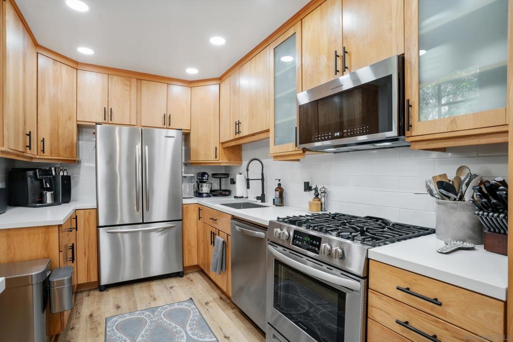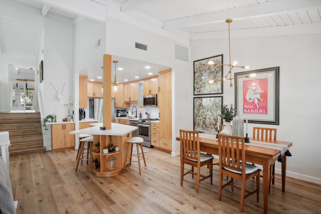 Welcome to Meadow Villas, a beautifully designed community in the heart of La Costa. This spacious end-unit townhome is filled with natural light, enhanced by large, new windows and sliding doors that highlight the warm and inviting brown tones throughout. The luxury vinyl floors and beautifully finished kitchen cabinets create an elegant and cohesive design, blending modern style with coastal charm. A fully updated kitchen features stainless steel appliances, new countertops, and a stylish tile backsplash. Designed with both aesthetics and functionality in mind, the space is perfect for cooking and gathering. The bathrooms have been thoughtfully updated to maximize luxury, featuring high-end fixtures and a pop of color on the cabinetry, adding personality and charm. Ample storage is available, with a spacious attic, generous closets, and an attached two-car garage. A separately routed WiFi channel upstairs ensures strong connectivity, a valuable addition for modern living. Custom Norman blinds have been installed throughout, with curtains added in the sunroom for enhanced privacy and style. Enjoy the sunroom off the upstairs bedroom, an inspiring space that can be used as a home office, reading nook, yoga area, or creative studio. Multiple outdoor spaces provide the perfect setting to relax and enjoy the beautiful coastal climate. This townhome offers one of the best values in the North County Coastal market!