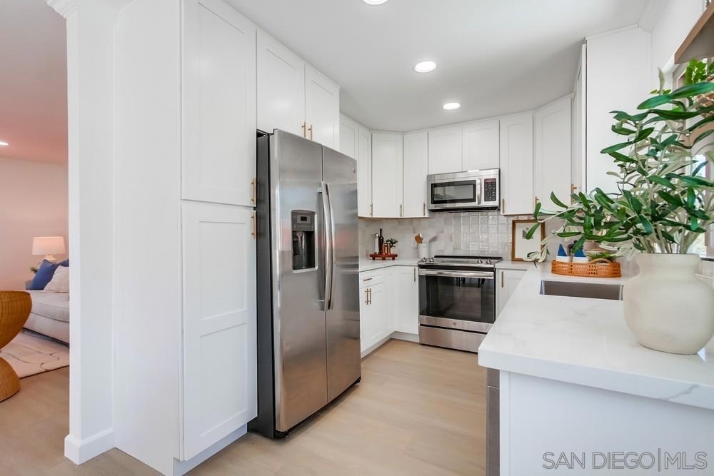Welcome to this stunningly renovated 2-Bed, 2-Bath! This beautifully remodeled end unit combines modern luxury with serene surroundings, with plenty of windows for great natural light & plenty cool ocean breezes. A spacious open layout with new luxury LVP flooring throughout. The large bedrooms provide ample space for relaxation, while the primary BR and living room boast scenic southerly views. The kitchen is a chef’s delight with sleek SS appliances, elegant stone countertops, and tasteful cabinetry. Enjoy spa-like comfort in the custom-tiled bathrooms, designed with stylish, high-end finishes. Featuring an attached 1-car garage and an additional reserved parking space, this private residence offers comfort and convenience in a quiet, well-maintained complex. Residents have access to multiple sparkling pools and tennis courts, creating the perfect blend of active lifestyle and tranquil retreat. Don't miss the opportunity to own this move-in ready gem in a highly sought-after community.
