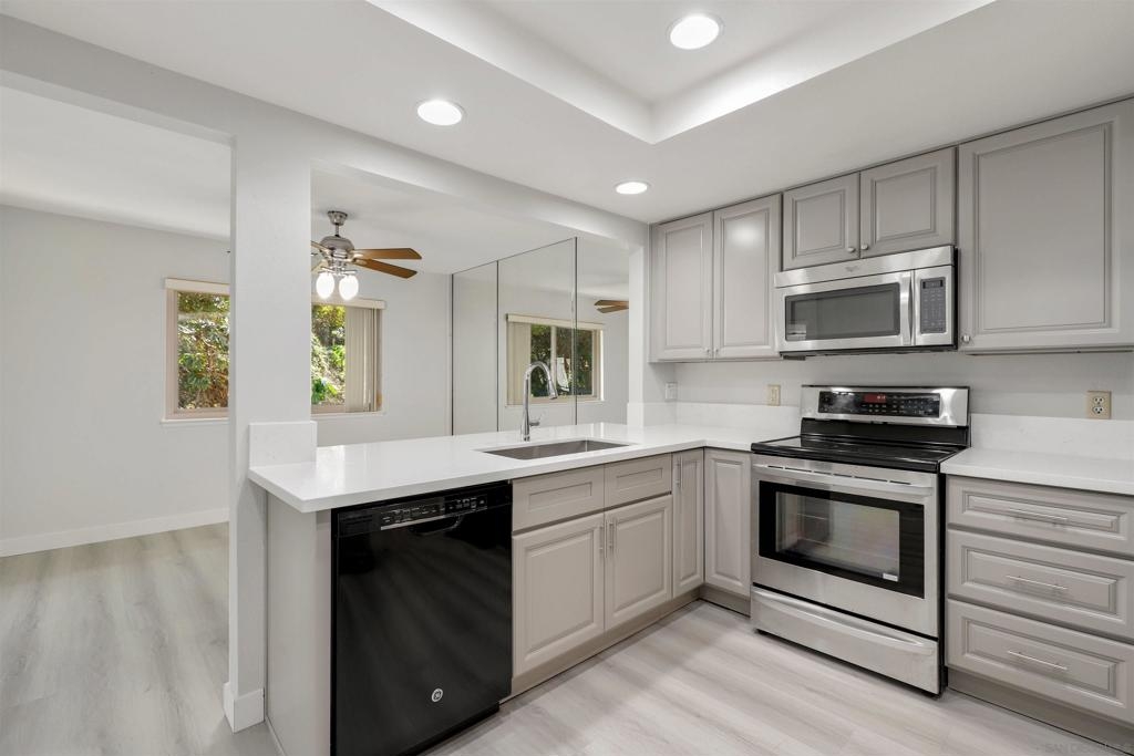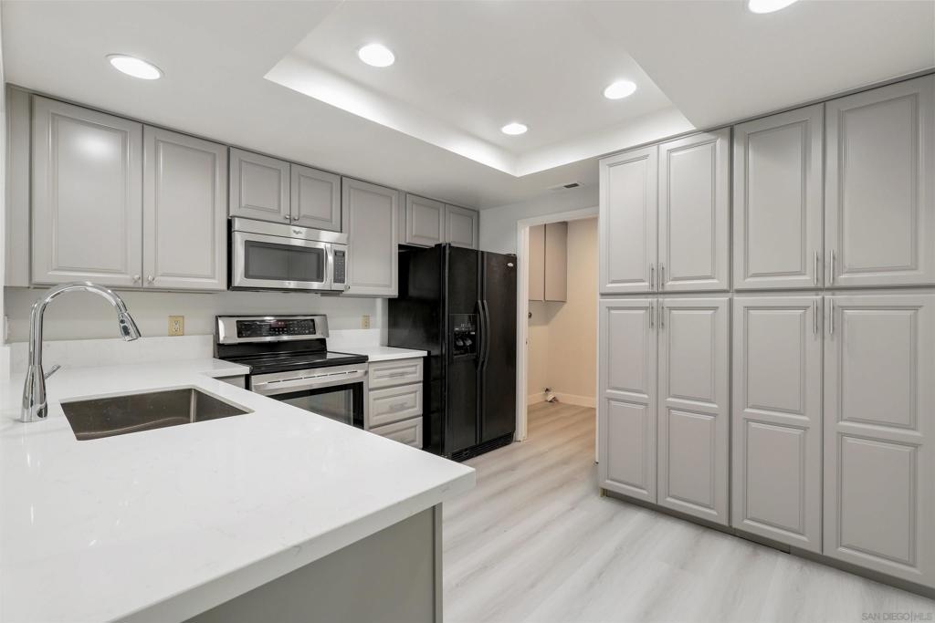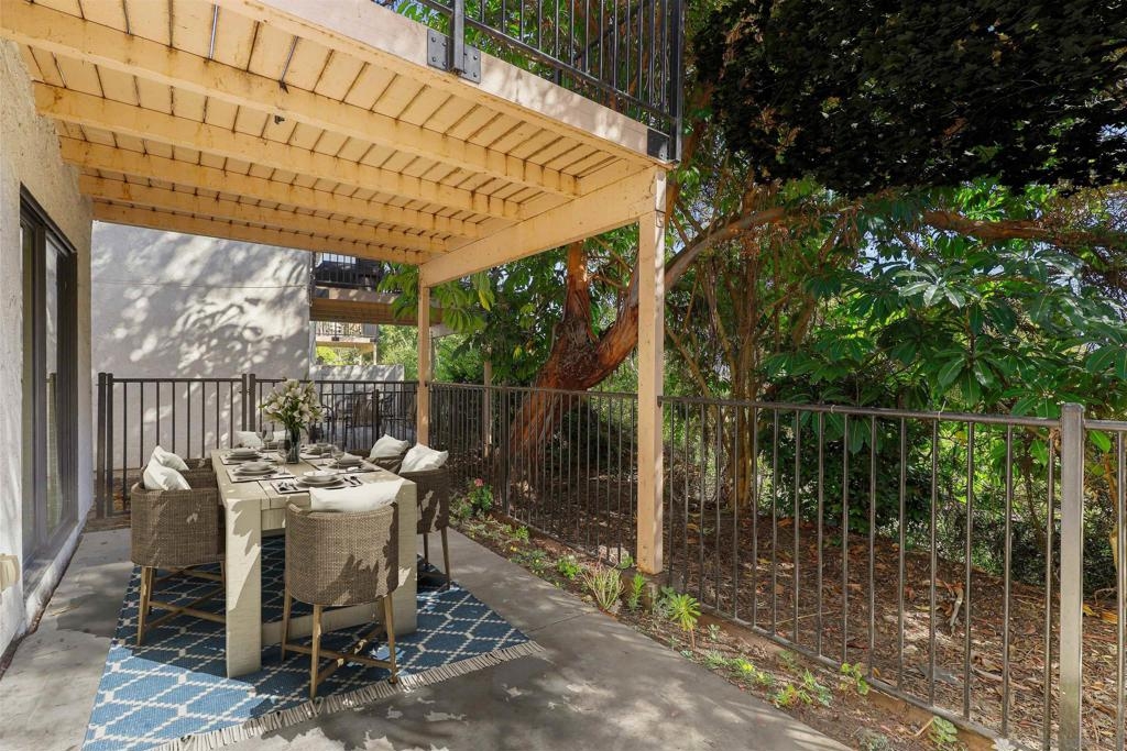 Gorgeous La Costa end unit is private and encased by mature trees creating a serene retreat. Enter to find new luxury vinyl flooring, fresh paint in neutral, on trend hues. The living room has a cozy fireplace and sliders that lead you to a large deck where you can sip a glass of wine or a cup of coffee and dine al fresco in the year-round idyllic coastal climate. The beautiful updated kitchen has new cabinets with additional wall pantry and storage, quartz countertops and opens to the formal dining room. A half bath and indoor laundry room completes the main floor. Meander downstairs to discover three generously-sized bedrooms. The primary bedroom enjoys the convenience of an ensuite, while the other two bedrooms share a hall bath. Primary bedroom and additional bedroom have large sliders that lead into a spacious private patio. As an added bonus there is a separate enclosed storage room, 1 car garage and additional assigned parking. Meadowridge is a serene community with plenty of mature shade trees creating a park-like atmosphere that offers its residents two pools, tennis courts and greenbelts that beckon you to relax in the soothing shade. The beach is less than 10 minutes away or enjoy a nice bike ride to save the hassle of parking. Great schools, shopping, dining and entertainment venues are all blocks away. Don’t let this opportunity pass you by!