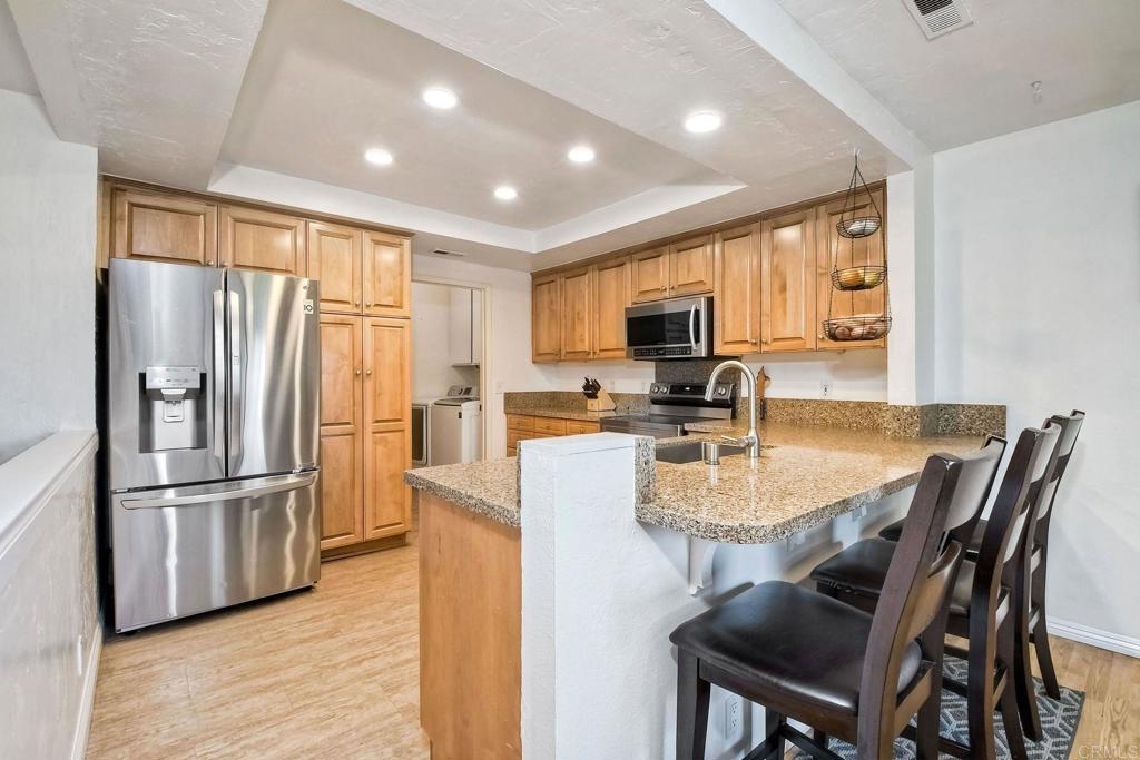 La Costa Meadowridge in Carlsbad! Located at the end of a quiet tree lined cul-de-sac with no one behind you. Light, bright, open floor plan, stainless steel appliances, granite counter tops, recessed lighting, dual pane windows, updated bathrooms, nice views off the balcony, 2 car attached garage, enjoy a glass of wine or BBQ with friends & family on the balcony or fenced in rear patio. Park like setting, lush mature landscaping. Water is included in the HOA!