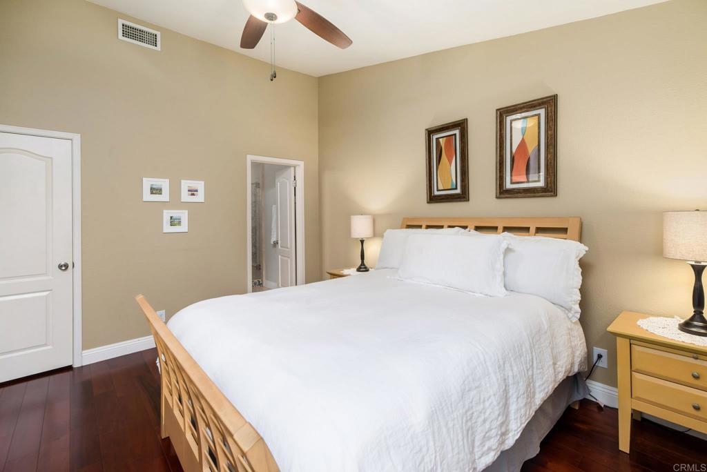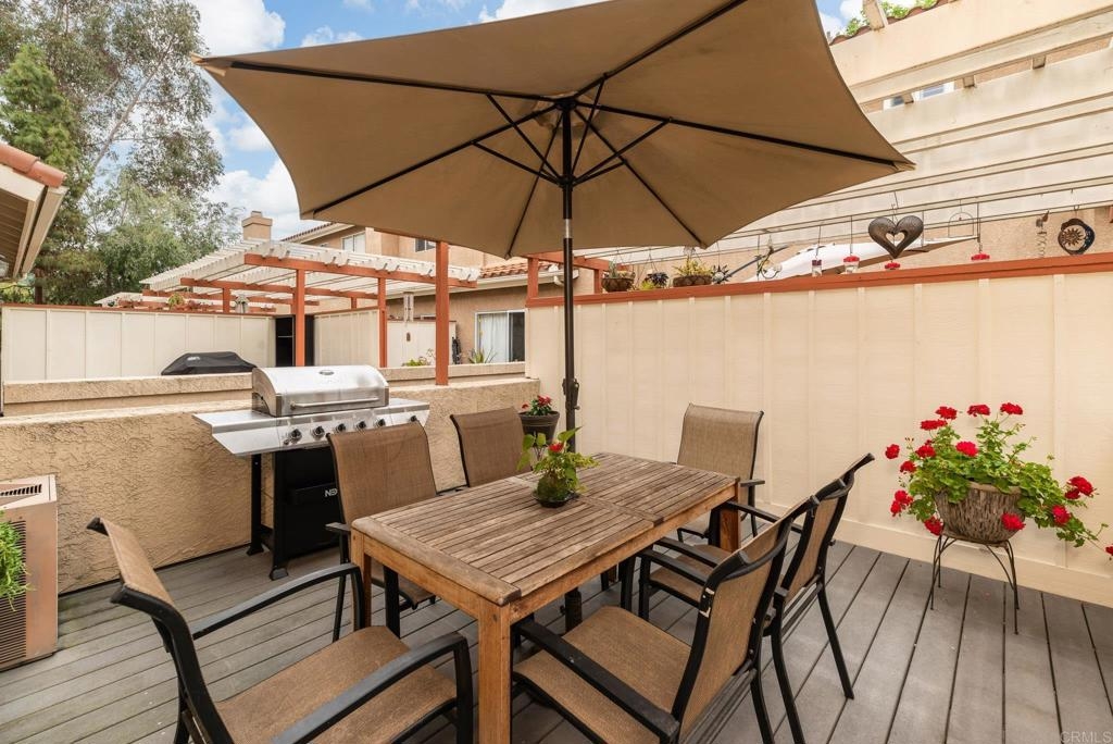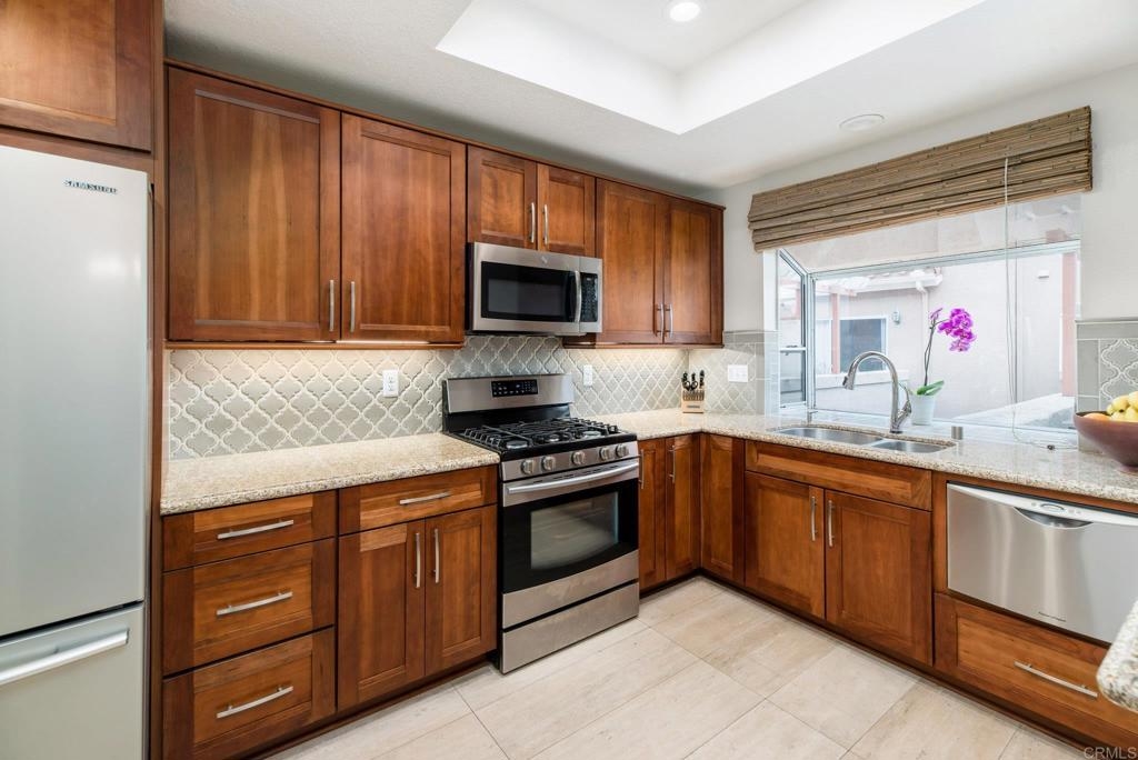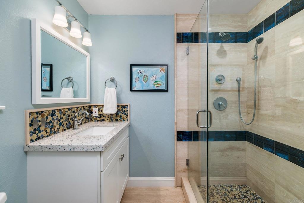 Welcome home to La Costa! Peacefully situated in the coveted gated community of Monarch Villas, this remodeled 2 bed | 2.5 bath townhouse is the paradigm of contemporary Southern California living offering privacy & comfortable sophistication w/ its idyllic location, refined open interior & owner-selected custom finishes. Desirable light & bright floor plan features dual primary suites with upgraded ensuite baths. Luminous open-concept main level offers a spacious high-end feel w/ gorgeous Curupay engineered wood floors seamlessly connecting the kitchen & living areas creating the perfect balance for casual lounging or hosting elevated gatherings alike. Upgraded kitchen equipped w/ granite counters, custom tile backsplash, SS appliances & travertine floors. Formal living room boasts an elegant fireplace w/ handmade Mexican tile & travertine base. Large sliding glass doors located off the dining room work to extend the comforts of the interior outdoors onto the spacious deck for a more alfresco setting built for entertaining family & friends! Convenient main-level half BA. Continue upstairs to the dual primary bedrooms. Each remodeled ensuite BA features travertine tile floors, new vanities, and large walk-in showers w/ all new custom shower tile & glass doors. Attached 2 car garage. Monarch Villas offers residents resort-style amenities: community pool, spa & tennis court. A neighboring walking trail leads to Batiquitos Lagoon overlook. HOA includes trash, water & sewer w/ exterior & landscaping maintenance. Top-rated Encinitas Elementary & San Dieguito High School Districts. Quintessential location all while maintaining privacy & exclusivity w/ easy I-5 access, just minutes from Encinitas & Carlsbad Villages, the beach & all that North County Coastal has to offer!