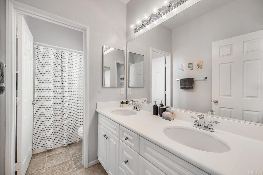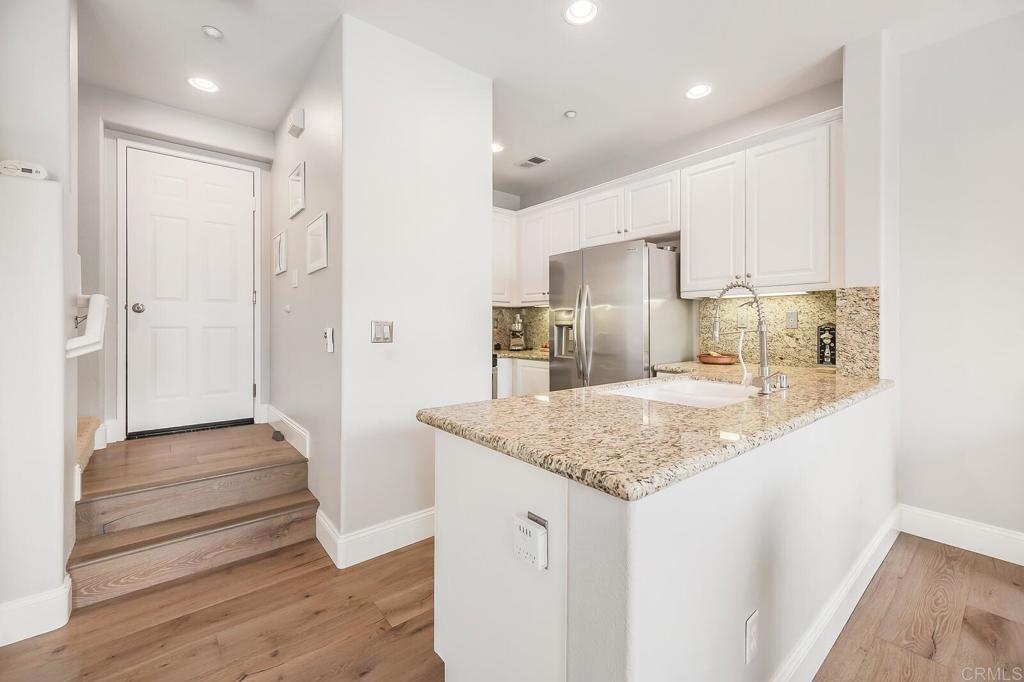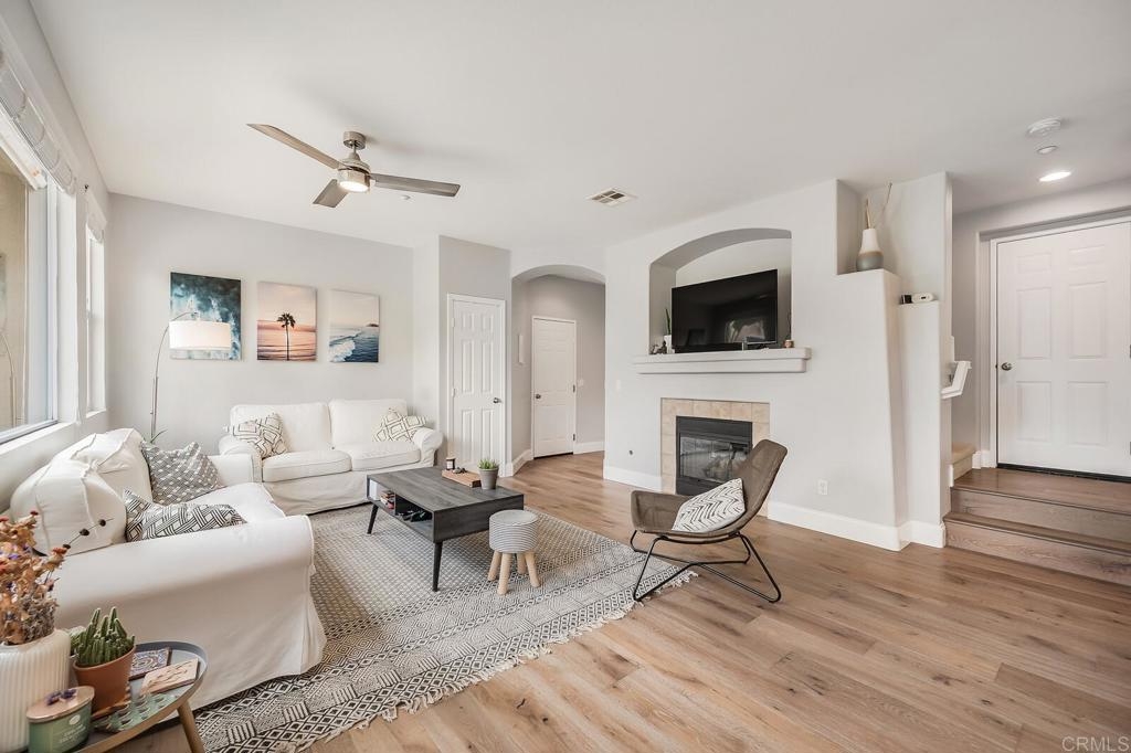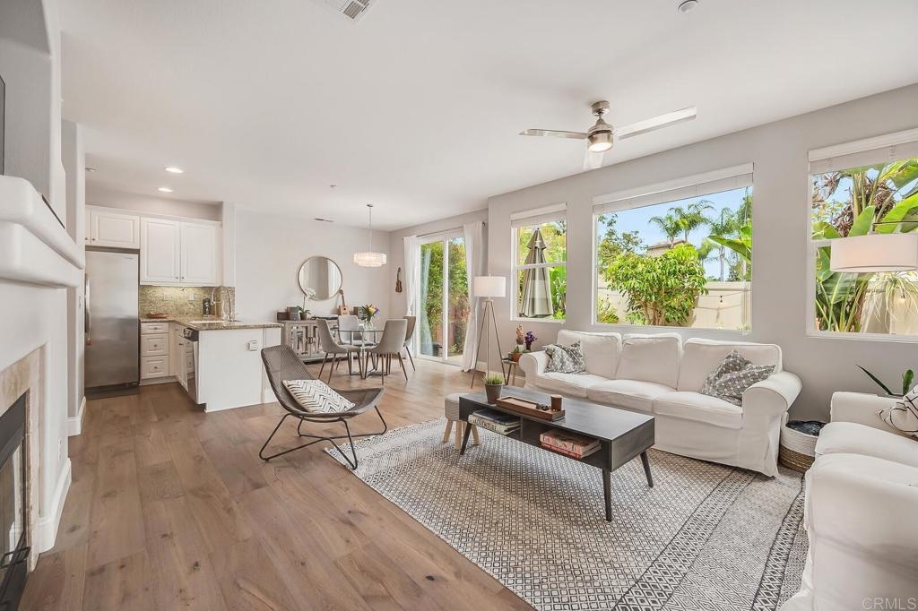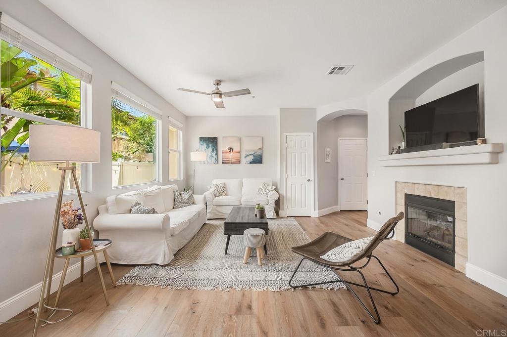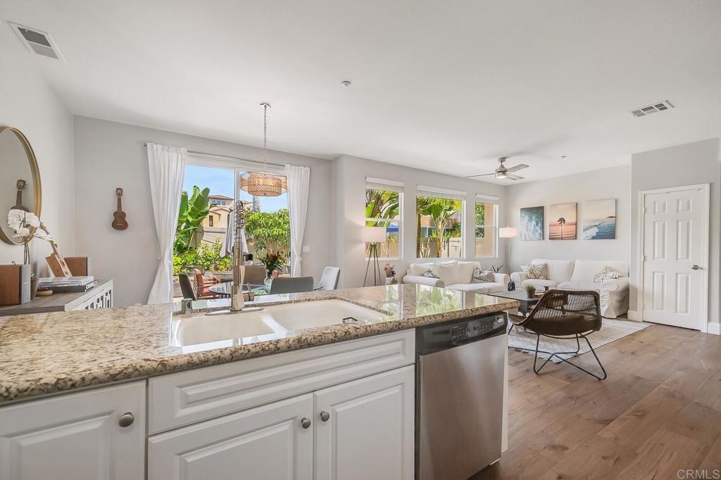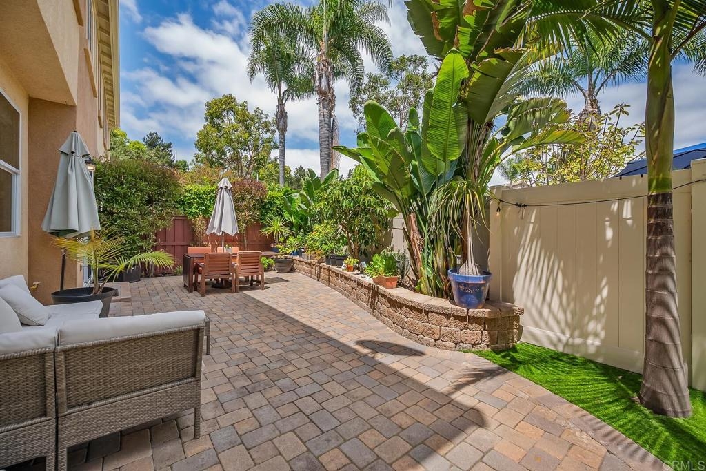 This beautifully maintained townhome is nestled in a quiet cul-de-sac within the highly desirable Mystic Point community, offering a rare combination of privacy, convenience, and scenic surroundings. With an open view and a private path leading directly to the community pool, it’s a serene retreat just minutes from the beach. Inside, a welcoming living room showcases warm hardwood floors, high baseboards, a gas fireplace, and thoughtful touches like a ceiling fan and window blinds. The updated kitchen features granite countertops, stainless steel appliances, and crisp white cabinetry—offering both modern style and everyday functionality. Upstairs, the spacious primary bedroom boasts a ceiling fan, peekaboo canyon views, and window blinds for added comfort. Both bathrooms are well-appointed with dual sinks and combined shower/tubs, while additional hallway cabinets provide extra storage. A rare highlight of this home is the pair of oversized, separate garages—offering increased wall space and storage capacity. Each garage includes epoxy flooring, painted walls, built-in cabinetry, and overhead storage. One garage has access to the backyard. The private yard and patio are beautifully landscaped and designed for easy maintenance, featuring a peaceful open view with a palm tree backdrop—without the upkeep. The patio includes a drainage system (a rare upgrade in the community), and the white vinyl fencing was replaced in September 2023. This home is the perfect blend of comfort, function, and location—ideal for those seeking to enjoy the best of Carlsbad living.