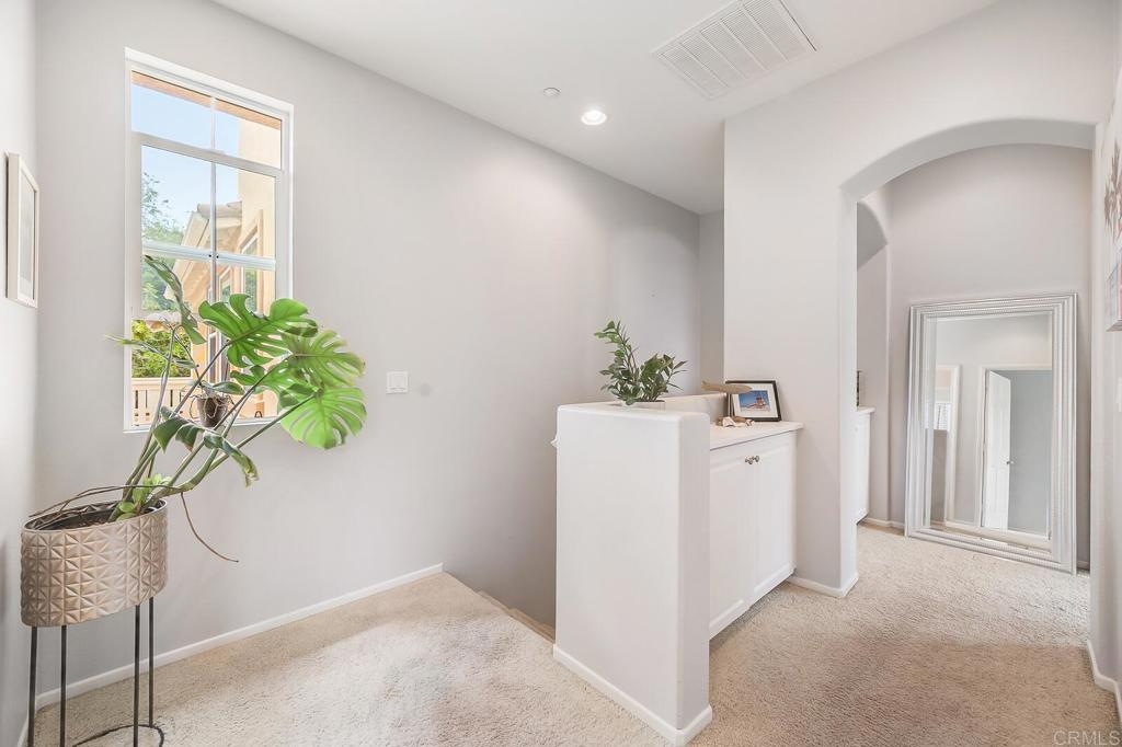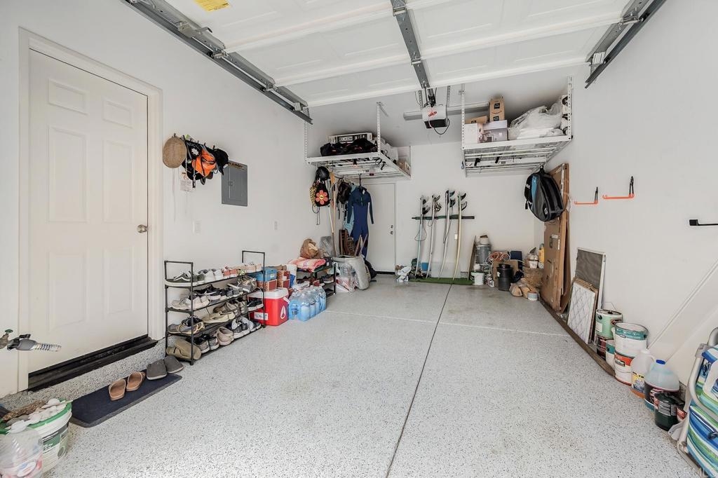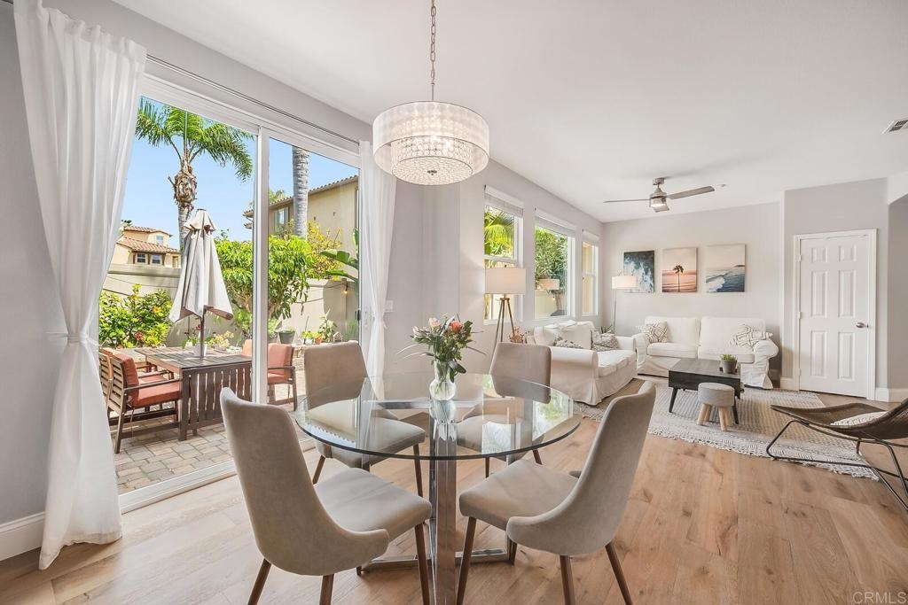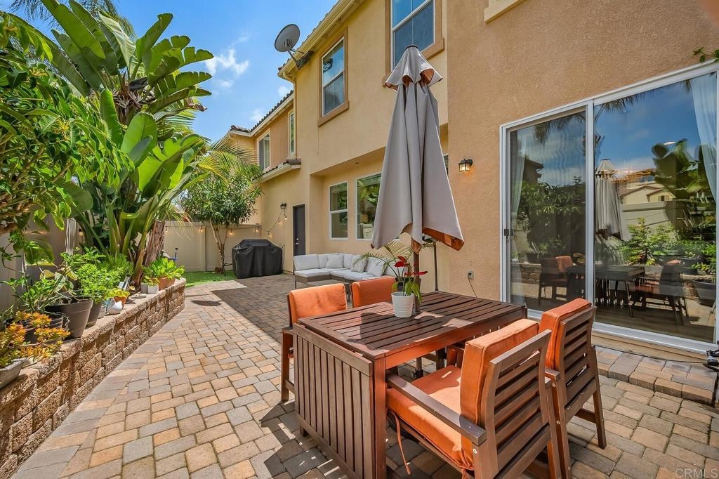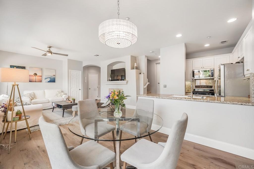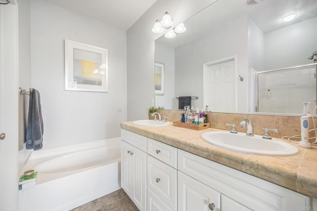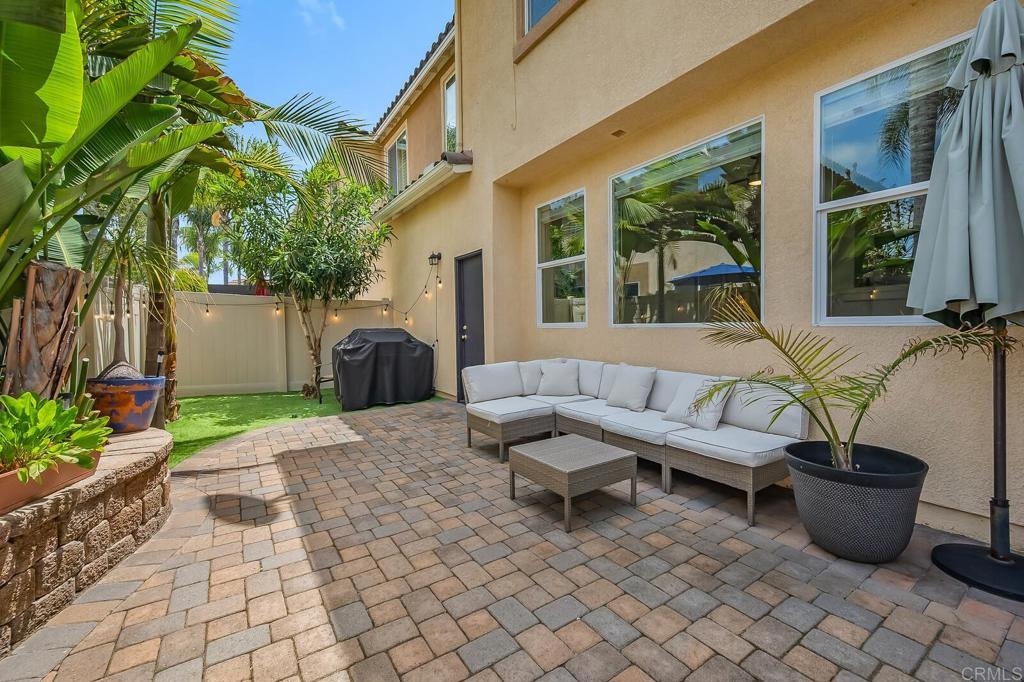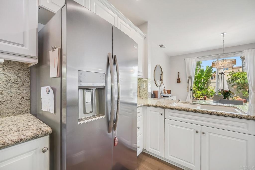 This beautifully maintained townhome is nestled in a quiet cul-de-sac within the highly desirable Mystic Point community, offering a rare combination of privacy, convenience, and scenic surroundings. With an open view and a private path leading directly to the community pool, it’s a serene retreat just minutes from the beach. Inside, a welcoming living room showcases warm hardwood floors, high baseboards, a gas fireplace, and thoughtful touches like a ceiling fan and window blinds. The updated kitchen features granite countertops, stainless steel appliances, and crisp white cabinetry—offering both modern style and everyday functionality. Upstairs, the spacious primary bedroom boasts a ceiling fan, peekaboo canyon views, and window blinds for added comfort. Both bathrooms are well-appointed with dual sinks and combined shower/tubs, while additional hallway cabinets provide extra storage. A rare highlight of this home is the pair of oversized, separate garages—offering increased wall space and storage capacity. Each garage includes epoxy flooring, painted walls, built-in cabinetry, and overhead storage. One garage has access to the backyard. The private yard and patio are beautifully landscaped and designed for easy maintenance, featuring a peaceful open view with a palm tree backdrop—without the upkeep. The patio includes a drainage system (a rare upgrade in the community), and the white vinyl fencing was replaced in September 2023. This home is the perfect blend of comfort, function, and location—ideal for those seeking to enjoy the best of Carlsbad living.