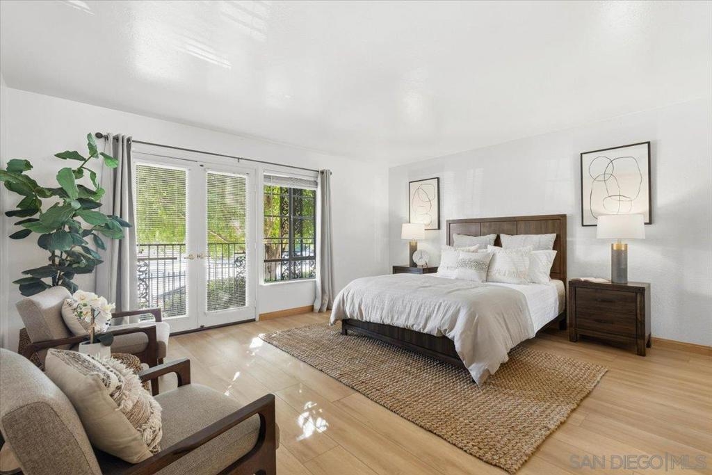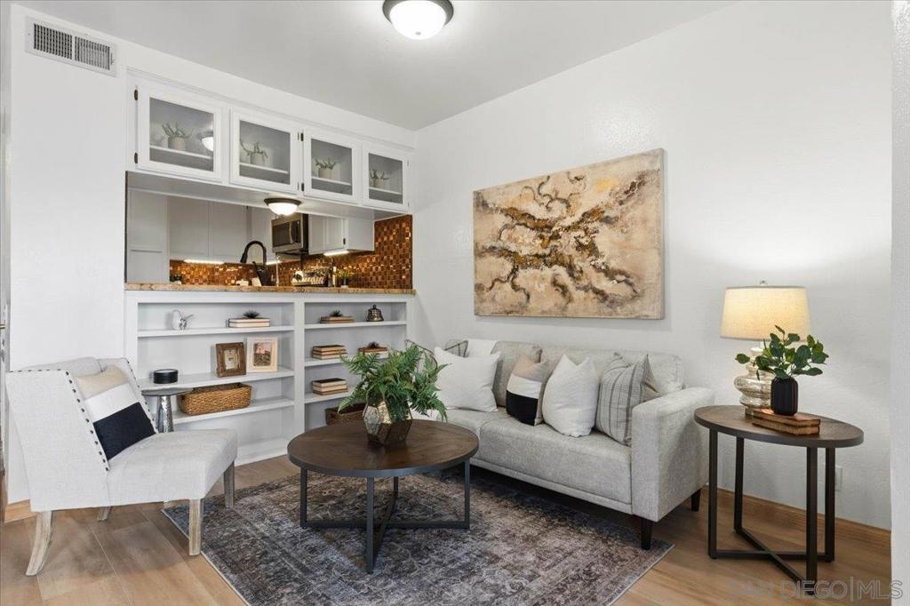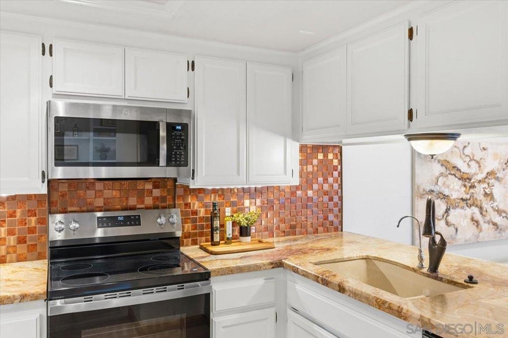 This charming and peaceful lower end unit offers a blend of classic character and modern updates, making it truly one of a kind within the community. Step inside to find a beautifully upgraded kitchen featuring quartzite countertops, a granite sink, freshly painted cabinets with roll-out shelves and a hidden trash compartment, a stunning copper and glass backsplash, and stainless steel appliances — including a new oven, new microwave, newer dishwasher, and newer refrigerator. The open-concept living and dining areas showcase custom built-in bookcases with elegant glass shelving, perfect for displaying your favorite décor. The entire unit features LVP flooring throughout and was freshly repainted in 2022, offering a bright and cohesive look. The bathrooms were tastefully remodeled in 2013, and the bathtub has been recently replaced. The primary suite includes a granite vanity with roll-out drawers, a sunken tub, and French doors leading to a private balcony — ideal for relaxing with your morning coffee. Additional highlights include a newer stackable washer and dryer and central A/C replaced in 2018. Situated at the end of a cul de sac, this gated complex offers a community pool & rec room. Enjoy the community’s serene atmosphere, with golf nearby and the beach just 5 miles away. This home combines comfort, style, and location — a must-see for buyers seeking something truly special in La Costa!