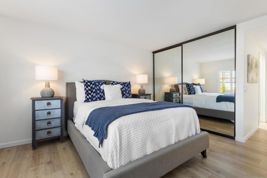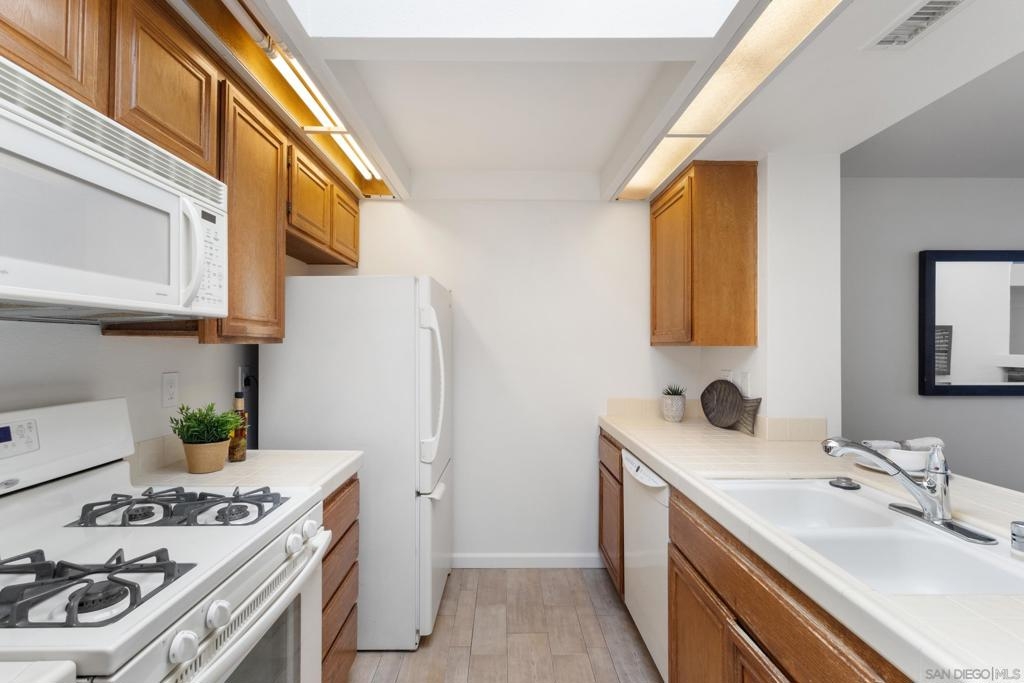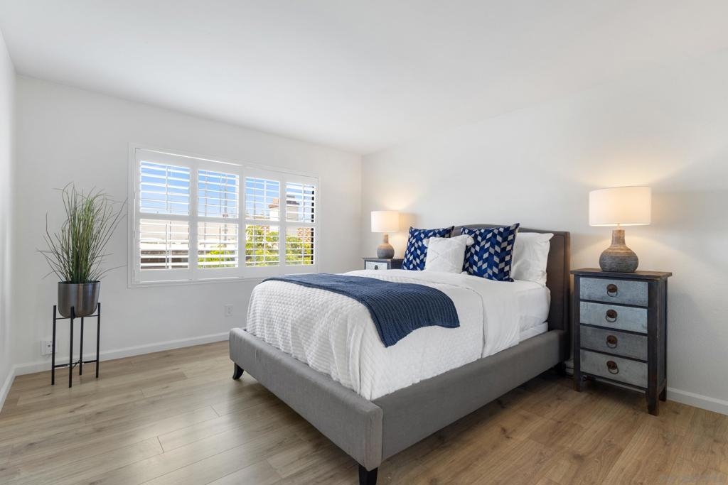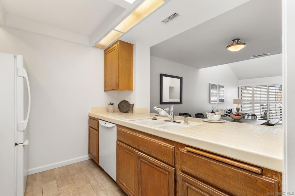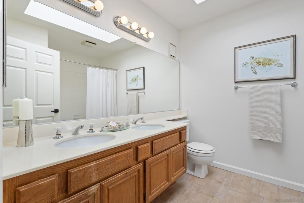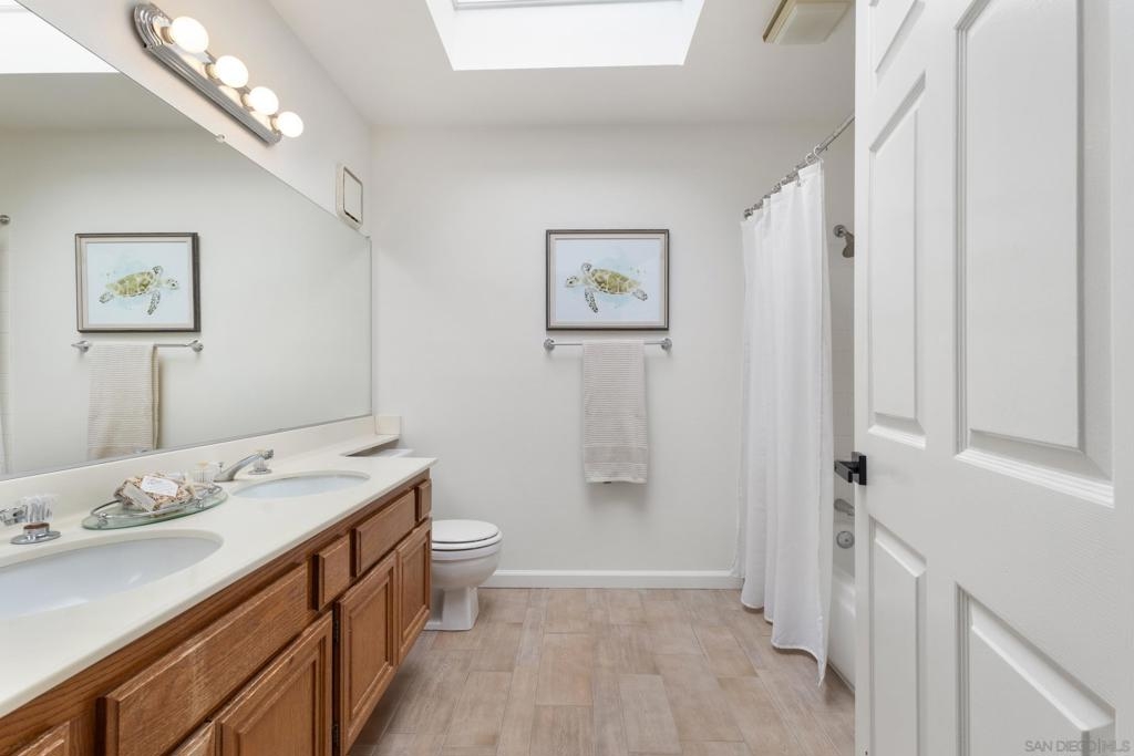 Welcome to this beautifully refreshed 2 Bed / 2 Bath, top-floor corner unit in the highly sought-after neighborhood of Paseo De La Costa in La Costa! This light and bright home features vaulted ceilings with skylights, plantation shutters throughout, brand-new luxury vinyl plank flooring, and fresh designer paint. The spacious layout includes a dedicated primary suite with its own full bath, a generous secondary bedroom, and open-concept living and dining areas that flow seamlessly onto a charming private balcony—perfect for enjoying peaceful views. Additional highlights include a full-sized washer and dryer in-unit, a detached one-car garage, and a reserved parking space located in front of your front door. Community amenities include a sparkling pool, relaxing spa, and a welcoming clubhouse. All of this in an unbeatable location—just minutes from premier shopping, dining, top-rated schools, and the iconic Omni La Costa Resort & Spa.