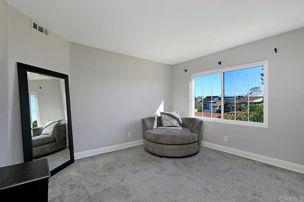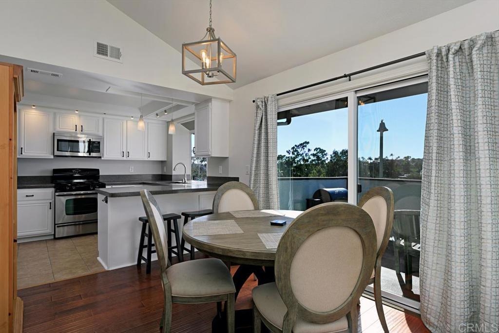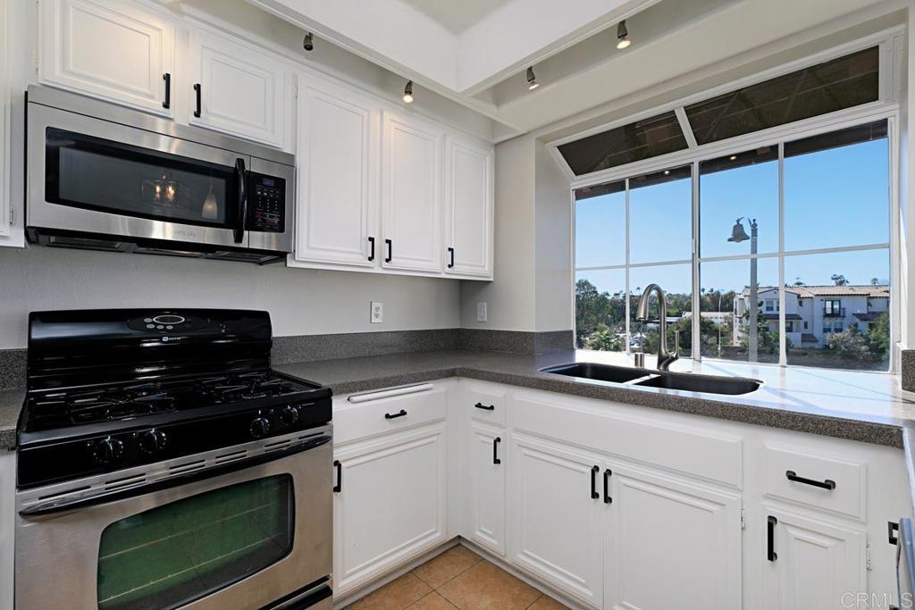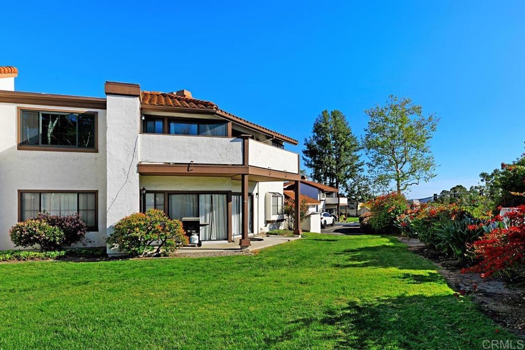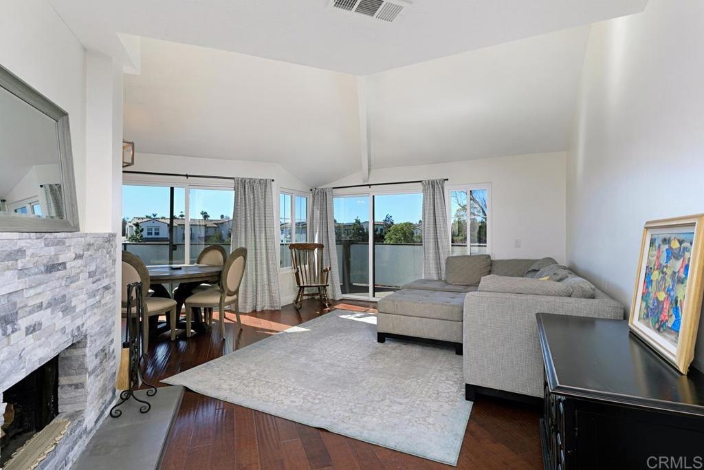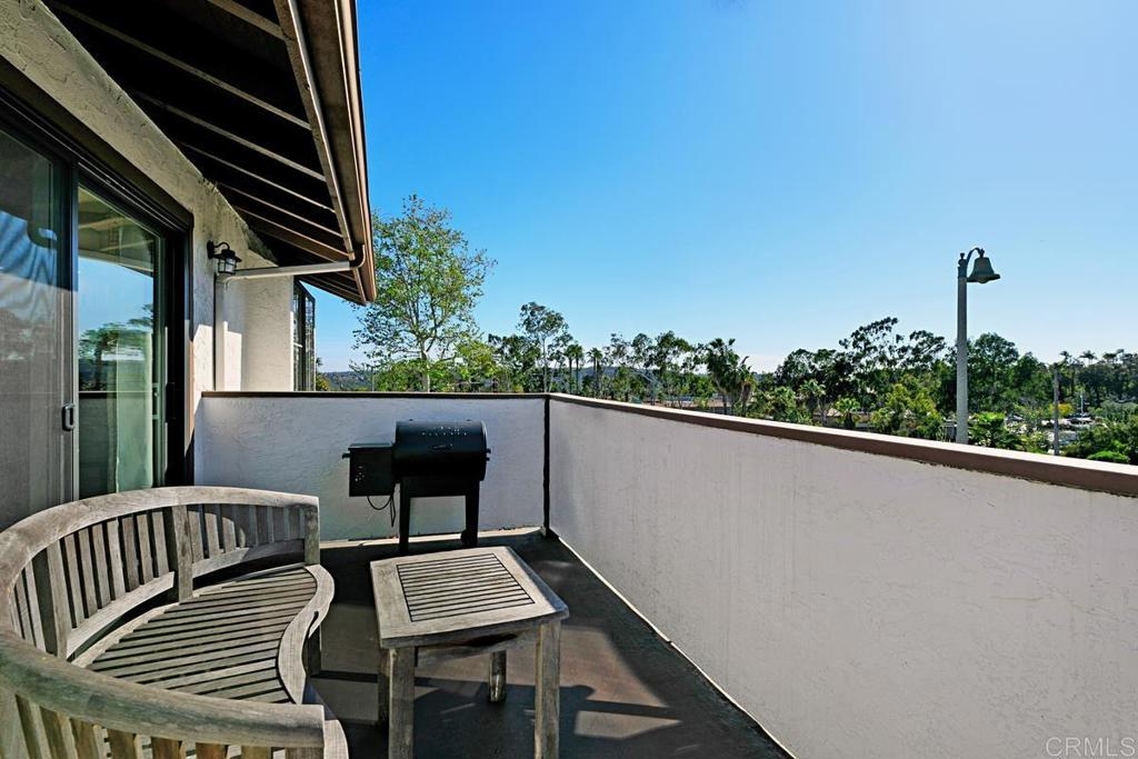Beautifully upgraded single level, end unit condo! Located on second level with an abundance of natural light. Extra large end unit balcony with expansive views. Freshly painted with newer; Milguard windows & slider doors, A/C & heating unit. Updated wood flooring, fireplace stone facade, baseboards and lighting fixtures. Stacked laundry in the unit. Detached 1-car garage and adjacent assigned parking space. Enjoy walking to Plaza Paseo Real with shopping, dining, Cinepolis theater and the Carlsbad Dove library. Community pool and spa, HOA pays for water and trash. Located in the coveted Carlsbad school district.