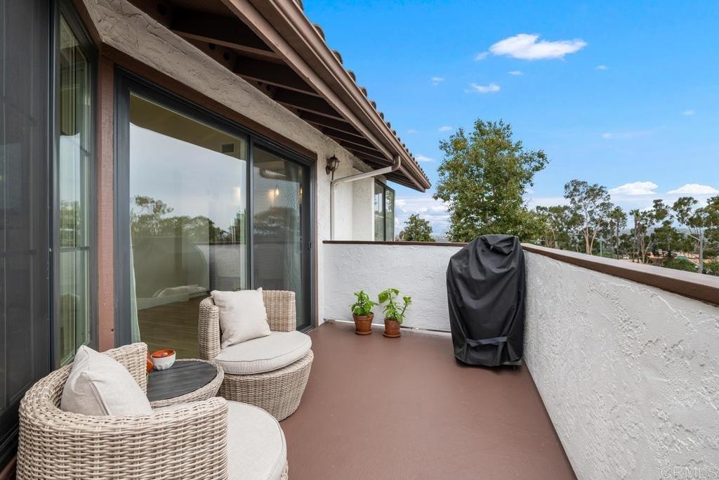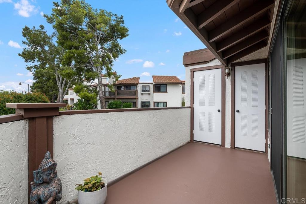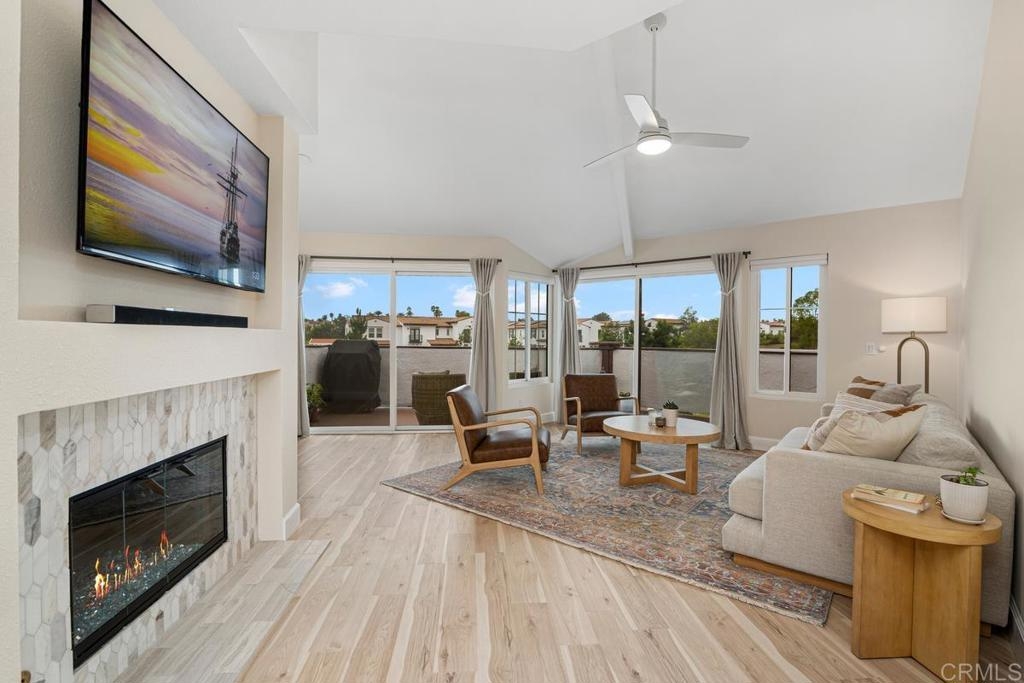 UPGRADES GALORE! Enjoy coastal breezes and gorgeous sunsets in your beautiful end-unit La Costa condo. An abundance of natural light and beachy elegance flows in this space with its vaulted ceiling and large west-facing balcony. This condo features almost a $100K in upgrades; kitchen boasts quartz countertops, cast-iron sink, all new stainless steel appliances, and pendant lighting. The family room has a custom tiled fireplace, mantel, hearth and added electrical outlets for TV, and electronics. Tastefully remodeled bathrooms with shaker-style vanities, quartz countertops, new hardware, mirrors, faucets and custom tile flooring and bathtub surrounds. The spacious master bedroom has dual closets w/custom built-ins. The Master bath has dual sinks, and a barn door for privacy. The additional bedroom features a custom-built Murphy bed with built-in shelving, adorned w/gold hardware & beautiful grey/green paint. Detached 1-car garage w/storage & adjacent assigned parking spot. Community pool & spa. HOA pays for water & trash. The location is surrounded by great restaurants, shopping, & the Cinepolis Movie Theater (all within walking distance). Carlsbad Unified School District. Only 4 mi from the beach, w/easy access to freeways. A/C. Second floor unit. Additional Upgrades include; All-new black door hinge hardware, smart thermostat w/ temperature sensors, new light fixtures, new waterproof laminate microbial wood flooring, baseboards, ceiling fans, front entry screen door, keyless entry w/fingerprint technology, new paint throughout, all new stainless steel appliances; refrigerator, gas range, microwave, and dishwasher, water purifier, garage storage, electrical outlets w/USB ports, custom blinds, dual pane Milgard windows.