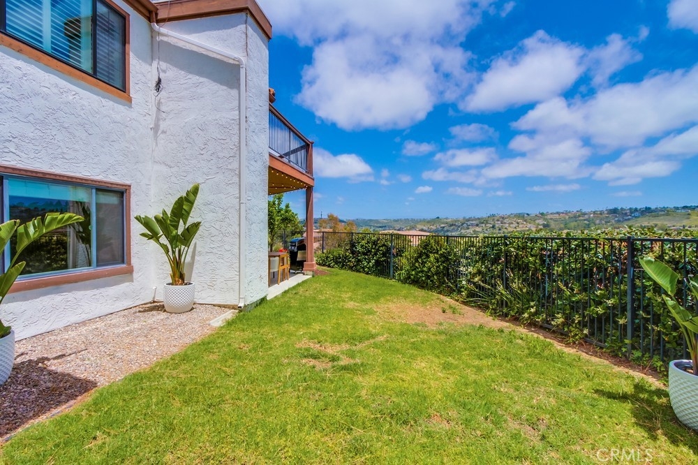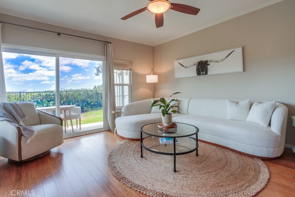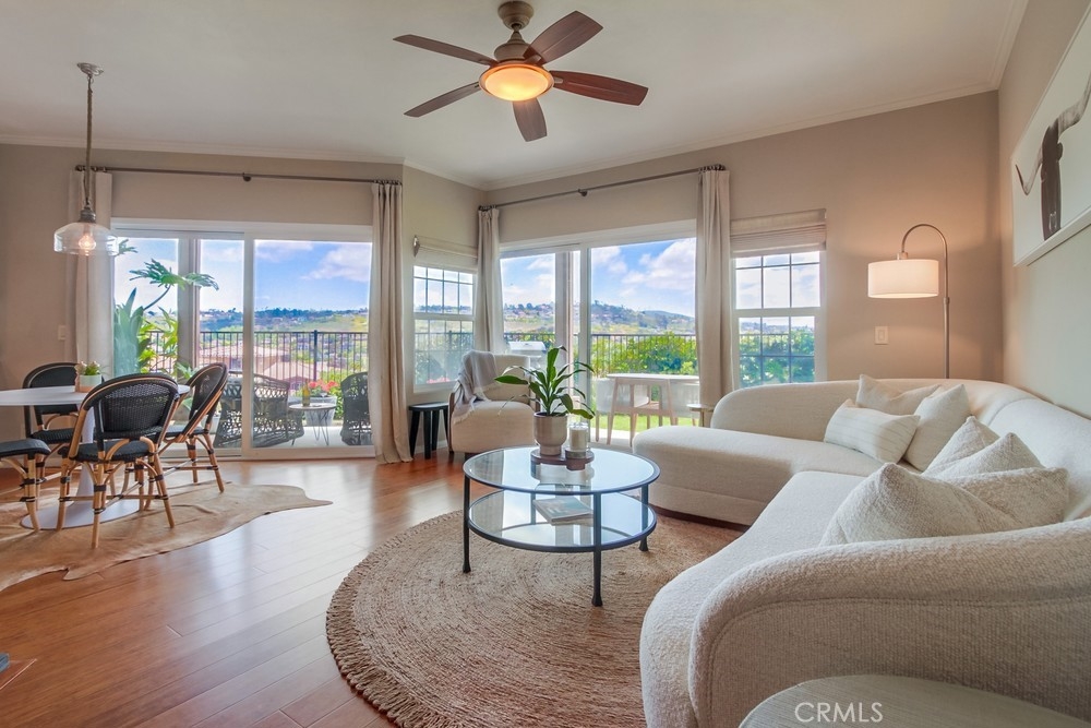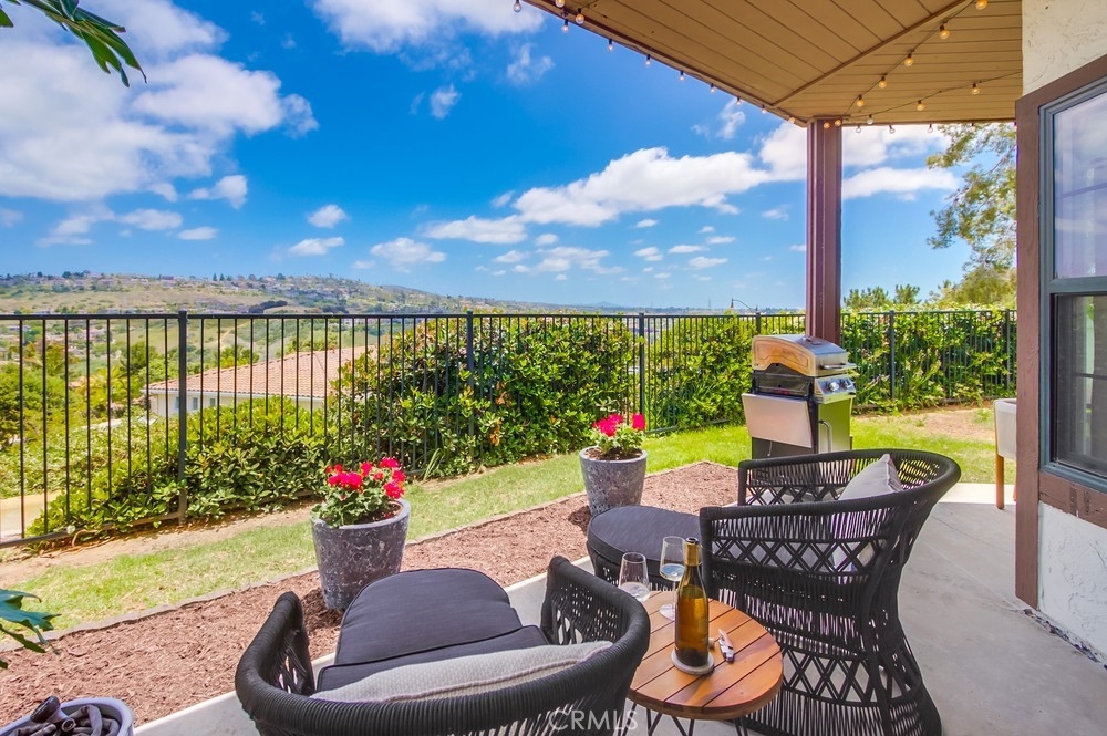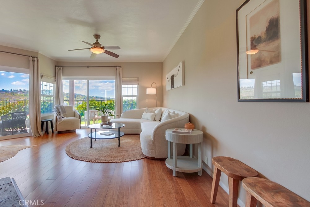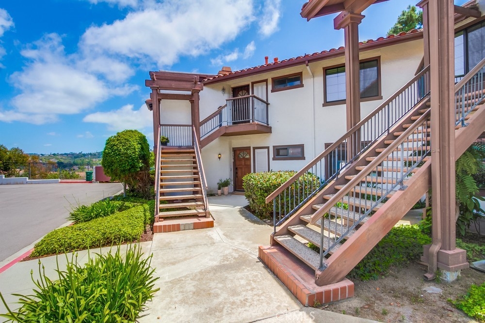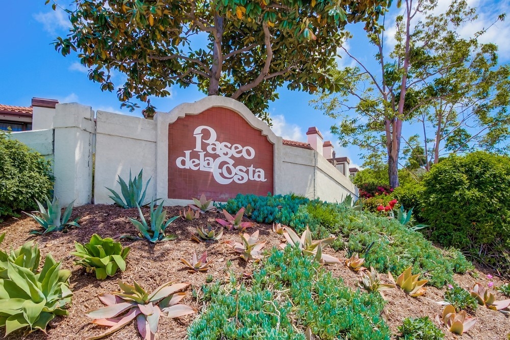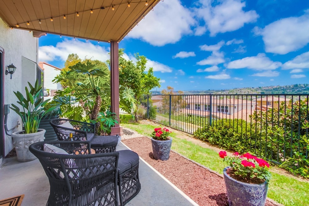 PANORAMIC VIEWS. This 2 bedroom 2 bathroom single story La Costa condo boasts unobstructed panoramic views of a beautiful valley above La Costa Golf Course and Black Mountain as far as 25 miles away. Enjoy San Diego weather at its finest with a double sided patio, green belt and mature landscape surrounding the unit. Situated as an entry level-end unit with maximum privacy, the condo features 10 ft ceilings and spacious views from all living windows and master bedroom. Hardwood floors, brand new quartz countertops, and brand new LG appliances including a freestanding double oven. Custom soft-close closet inserts in both bedrooms, custom window coverings and snap lock design windows. Single car garage with storage loft right outside of unit with an additional assigned uncovered parking space & 2 guest passes for community parking. Enjoy the Plaza Paseo Real with a grocery store, restaurants, & Cinepolis just across the street or take a short drive to the Batiquitos Lagoon trail and Gandview Beach.