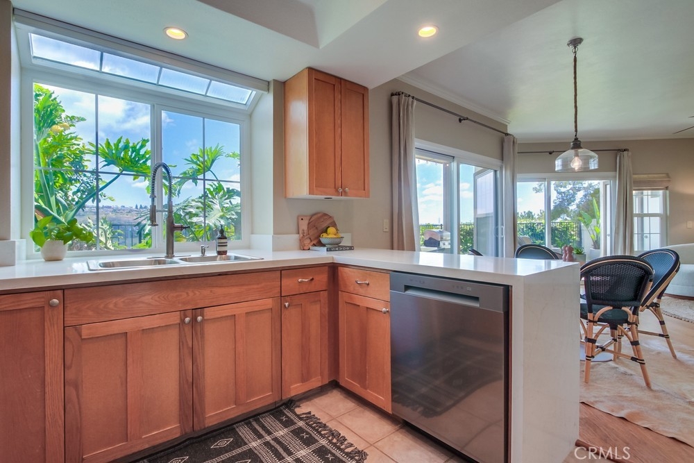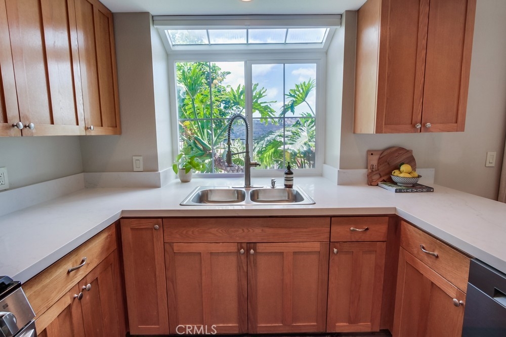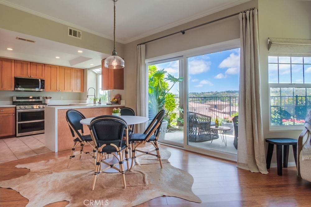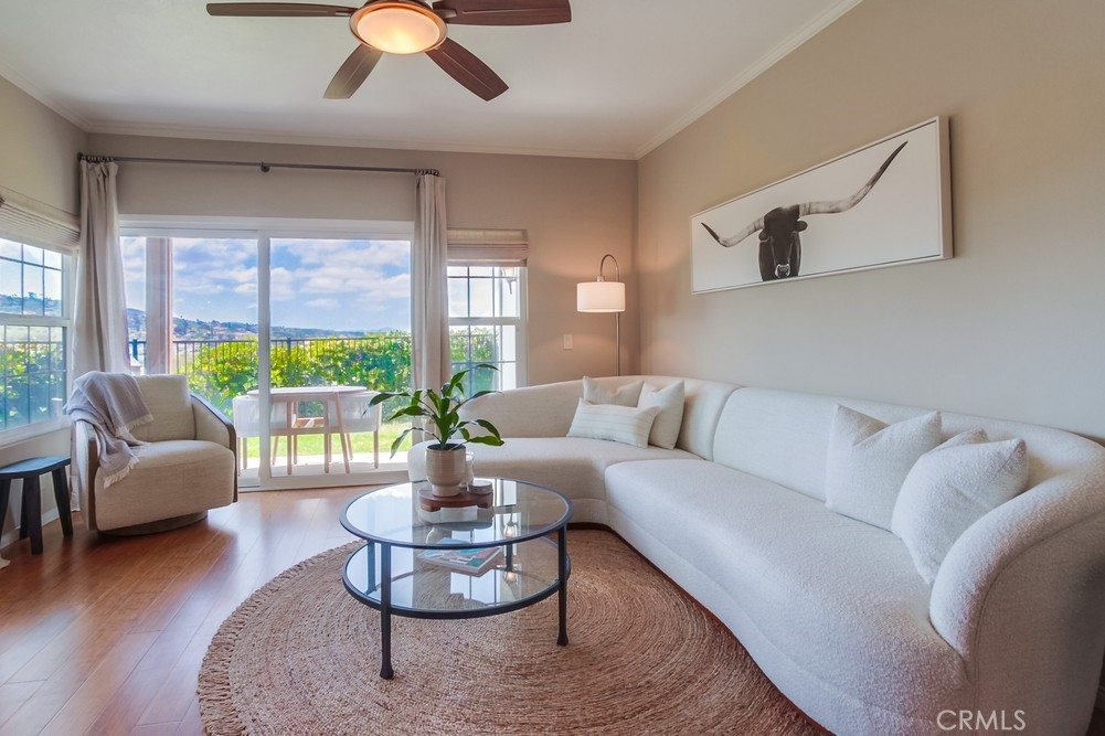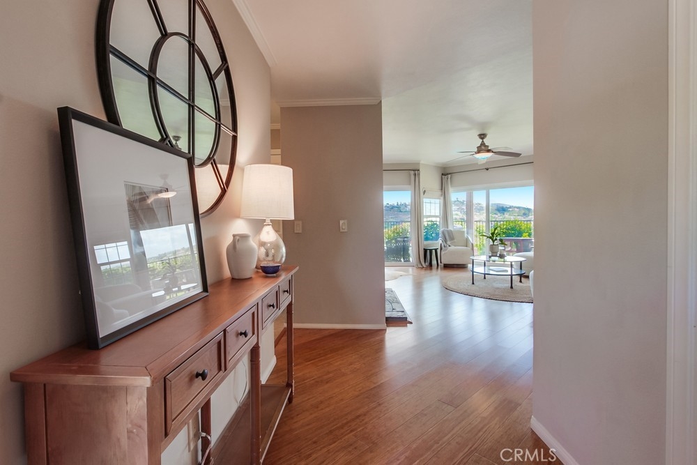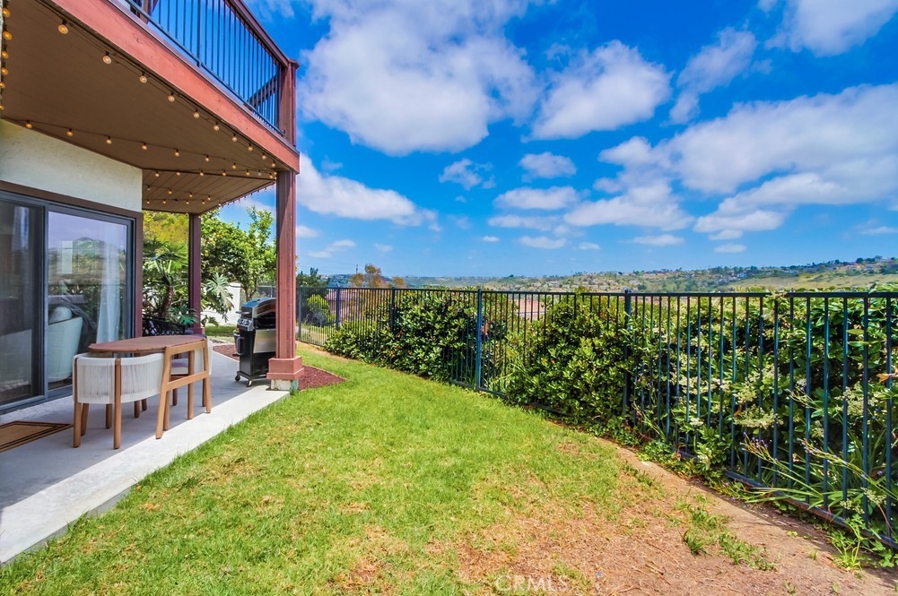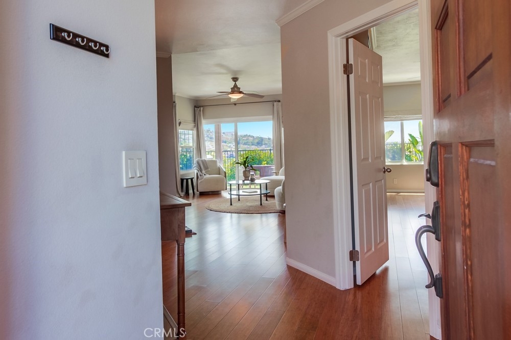 PANORAMIC VIEWS. This 2 bedroom 2 bathroom single story La Costa condo boasts unobstructed panoramic views of a beautiful valley above La Costa Golf Course and Black Mountain as far as 25 miles away. Enjoy San Diego weather at its finest with a double sided patio, green belt and mature landscape surrounding the unit. Situated as an entry level-end unit with maximum privacy, the condo features 10 ft ceilings and spacious views from all living windows and master bedroom. Hardwood floors, brand new quartz countertops, and brand new LG appliances including a freestanding double oven. Custom soft-close closet inserts in both bedrooms, custom window coverings and snap lock design windows. Single car garage with storage loft right outside of unit with an additional assigned uncovered parking space & 2 guest passes for community parking. Enjoy the Plaza Paseo Real with a grocery store, restaurants, & Cinepolis just across the street or take a short drive to the Batiquitos Lagoon trail and Gandview Beach.