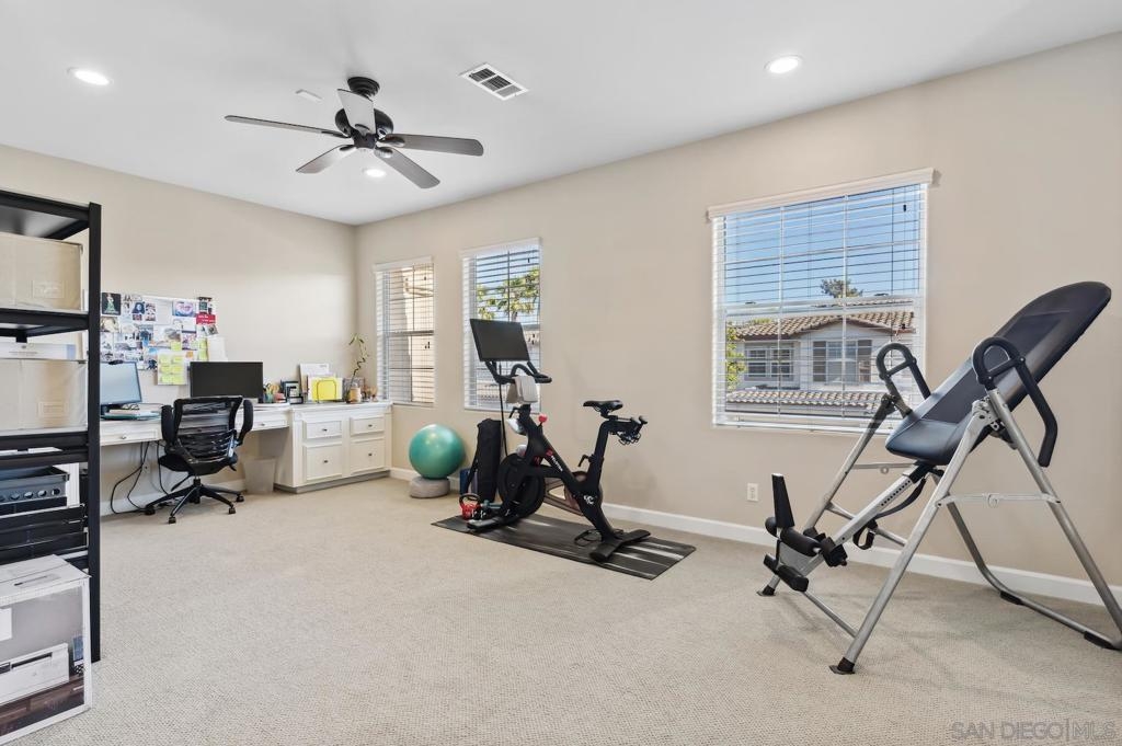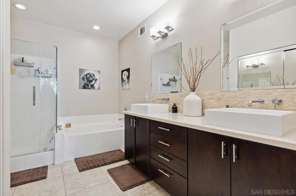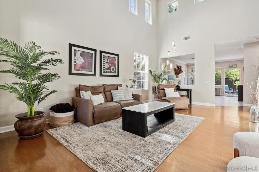Welcome to this beautifully upgraded residence, located in the highly desirable gated community of Poinsettia Heights. This rarely available floor plan offers a FIRST FLOOR PRIMARY BEDROOM. Originally built as a 3-bedroom, the upstairs has been reimagined to create an expansive open loft, perfect for a home office, media room, or flexible living space. If desired, the third bedroom can easily be restored by reinstalling a wall. The remodeled kitchen is a true showstopper, featuring modern cabinetry, natural stone backsplash, GE Profile stainless steel appliances, a built-in 30-bottle wine cooler, Silestone countertops, & under-cabinet lighting. The open-concept living and dining areas flow seamlessly, highlighted by wood floors, designer lighting, custom baseboards, and an abundance of natural light. There is an EV Car charger located in the garage. The backyard features professional landscaping with accent lighting and stamped concrete patio, perfect for outdoor entertaining. Residents enjoy resort-style amenities including a pool, spa and barbecue area within the gated community. Ideally situated near Aviara Park, Poinsettia Community Park, world-class golf, shopping, dining, Legoland, Carlsbad beaches, and within the highly rated Carlsbad School District.
