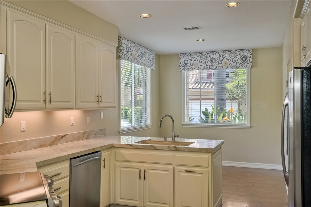 Really pretty and nicely upgraded Sanderling townhome with the master on the first floor! Hardwood flooring throughout the first floor. Kitchen remodeled with white cabinets, quartzite countertops and stainless steel appliances. Adjacent eating nook. Central air conditioning. Washer, dryer and refrigerator convey. Huge backyard completely paved with a built-in gas bbq and firepit plus tons of room for patio furniture and great entertaining spot. Cul de sac location. Romantic fireplace in living room. Sanderling is a very desirable Aviara townhome community with 2 community pools/spas and greenbelt. Great central location walking distance to Aviara Oaks Elementary and Middle Schools, library, post office, Cinepolis, and Vons shopping center with many restaurants, banks, nail salon and hair salon. This unit is nicely updated and upgraded and features crown moulding, tall baseboards, mirrored closet doors, closet organizers, beveled glass windows in the living room and a beautiful ceiling fan in the dining room area.. Neighborhoods: Sanderlng Complex Features: ,, Equipment: Dryer,Garage Door Opener, Washer Other Fees: 118 Sewer: Sewer Connected Topography: LL