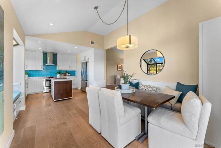 Experience coastal living at its finest in this immaculate, top-floor corner residence offering panoramic views stretching all the way to the Pacific. Flooded with natural light, this 3-bedroom, 2-bath home combines modern design with relaxed elegance. The open-concept living area showcases vaulted ceilings, wide-plank white oak flooring, and seamless flow between the living, dining, and kitchen spaces. The custom kitchen stands out with white shaker cabinetry, quartz countertops, and premium stainless steel appliances — the perfect setting for entertaining or enjoying everyday meals with a view. The spacious primary suite is a private retreat, featuring two walk-in closets and a spa-inspired bathroom with designer tile, dual vanities, and a luxurious walk-in shower. Two additional bedrooms offer flexibility for guests or a home office, complemented by an equally stylish secondary bath. Additional features include in-unit laundry hookups, a private one-car garage plus an assigned parking space, and thoughtful upgrades throughout. Located within the sought-after Sea Point Tennis Club, residents enjoy access to tennis courts, multiple pools and spas, and beautifully maintained grounds. All just minutes from La Costa’s best shopping, dining, golf, hiking trails, and beaches.