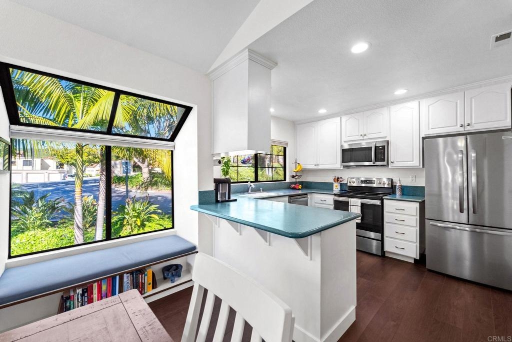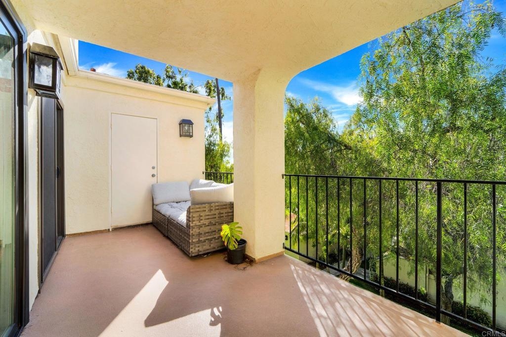 Beautifully appointed upstairs end unit located in the highly desirable community of Sea Point Tennis Club. Offers 3 bedrooms, 2 baths plus a 1 car detached garage conveniently located nearby. An extensive balcony extends along the entire back side of the property with sliding glass door allow access from dining room, living room and primary bedroom. These sliders offer tons of natural light throughout. The vaulted ceilings and new recessed lighting accent the space giving this home a spacious, open bright airy feel. There is new wood flooring, two panel shaker doors, gas fireplace, lots of built-in cabinets which provide plenty of storage plus an indoor laundry area. The community offers 4 tennis, 2 pools, and 3 hot tubs all in a well-maintained park like setting. Sea Point is located only mins to the beach, freeway access, several outstanding golf courses, walking trails and multiple shopping centers. This home is also in the highly rated Encinitas School District.
