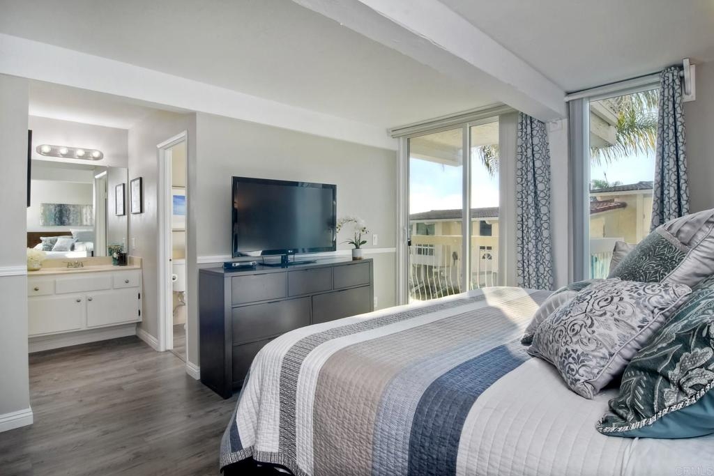 Morning sunrise on one side of your home and Amazing afternoon Sunsets with lagoon and Peak Ocean views from the upper balcony on the other side! What a great price for a huge townhome featuring 1536 SF of loft feeling living space two balconies and an exterior private patio sitting area. This unique townhome with so much natural light is truly a gem! Entertain in this open living layout with modern wide plank flooring, designer colors and updates throughout. One of the best La Costa locations around as you have easy access to world famous beaches / surfing, shopping, restaurants, libraries, theaters, & easy access to highways to nearby beach towns or convenient commute to San Diego.