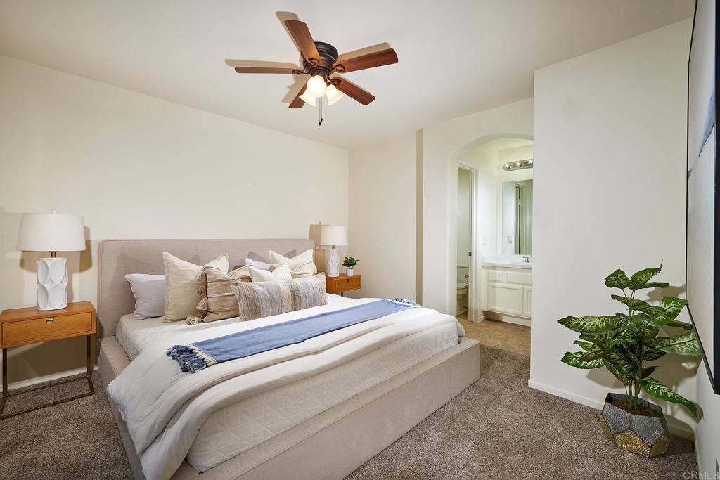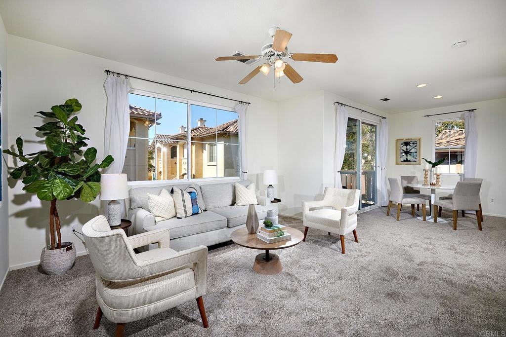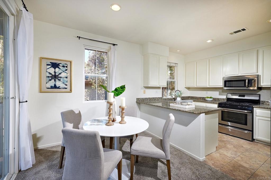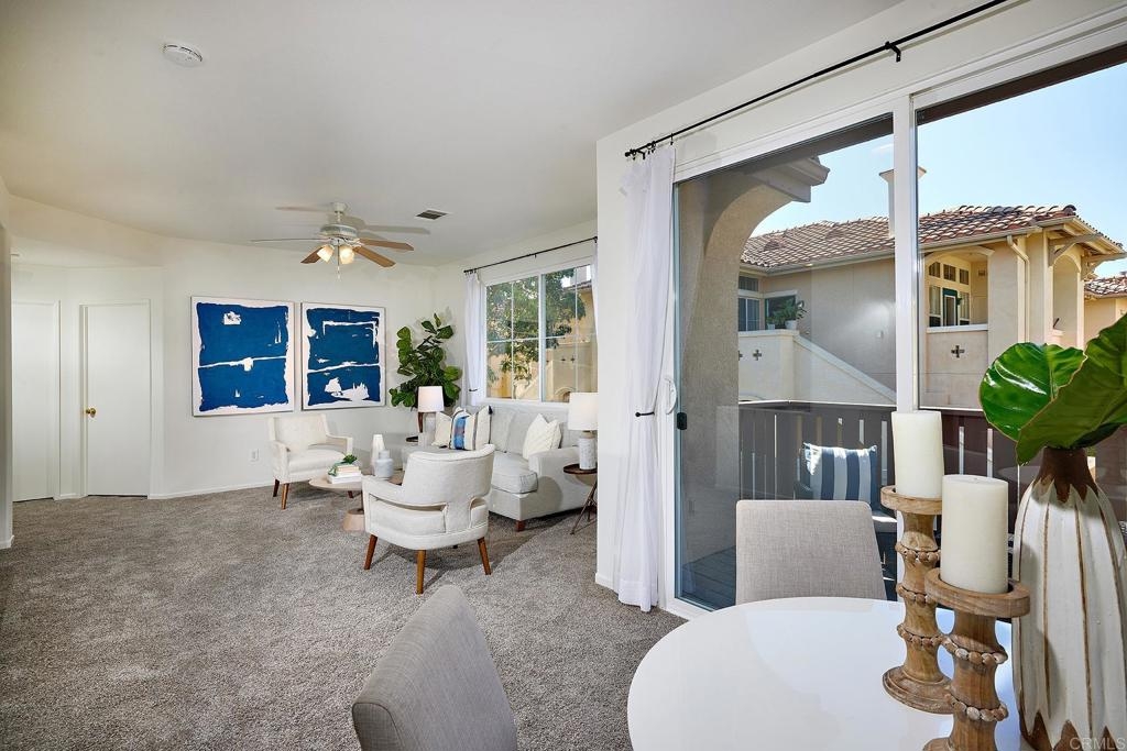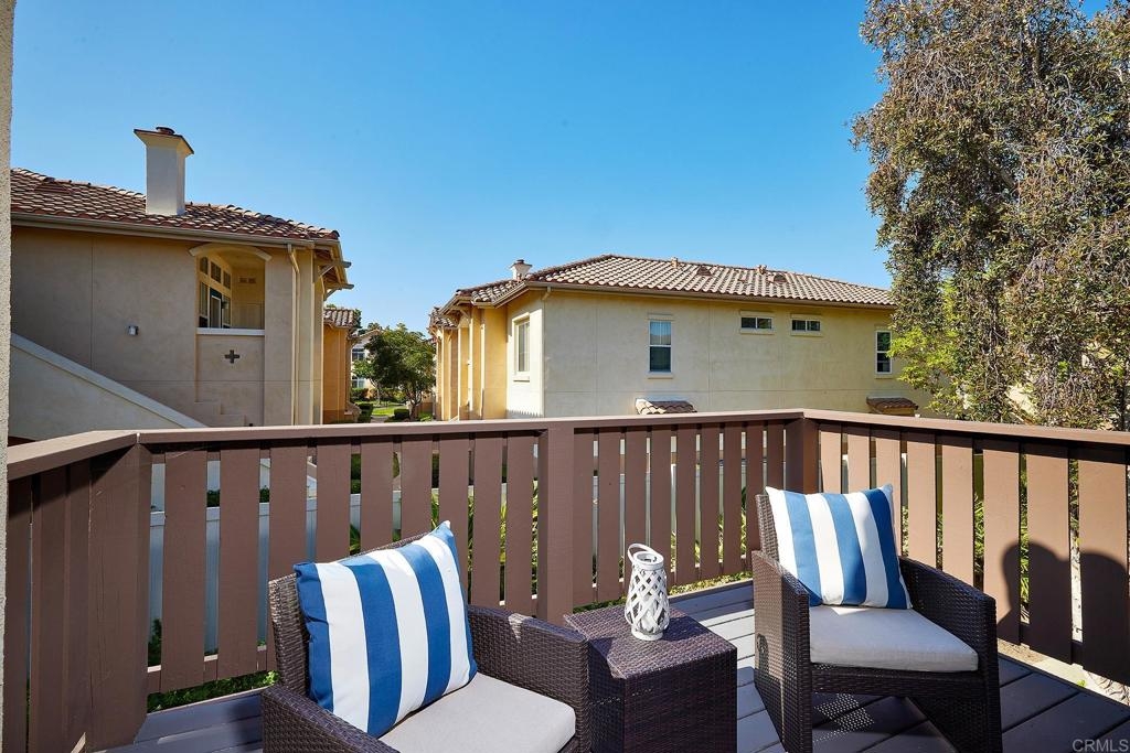 Nestled in a prime location, this beautifully renovated Rancho Carrillo home has been tastefully upgraded with fresh paint and new plush carpet. The open concept great room is flooded with natural light, creating an inviting and airy atmosphere. The spacious layout seamlessly integrates the living and kitchen areas, and the deck off of the dining room provides a perfect space for entertaining guests. The primary bedroom, located on the first floor, features a new sleek quartz countertop in the ensuite bath and the covered patio offers the ideal spot to enjoy your morning coffee. Additional upgrades include slab granite countertops, stainless steel appliances and soft close hinges.The highly sought-after Rancho Carrillo community offers an array of amenities, including parks, walking trails, and pool facilities, allowing you to embrace an active and vibrant lifestyle. With its convenient location, you'll have easy access to shopping, dining, and entertainment options, ensuring that you're never far from the action. Additionally, you'll be pleased to discover that the award-winning Rancho Carrillo Elementary School is within walking distance, and the pristine Carlsbad beaches are just a short 5-mile drive away.