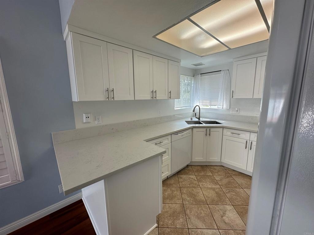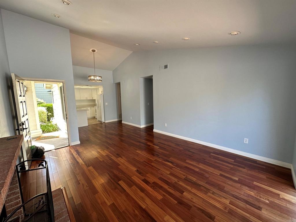 Welcome to Carlsbad, and single story living. Beautiful Cherry wood floors throughout. New kitchen with quartz counter tops, and newer appliances. Vaulted ceilings in living room with fireplace, create a light and airy atmosphere in the open-concept floorplan. Convenience of indoor laundry closet with full size washer/dryer. Private patio with large storage closet. Two assigned parking spaces nearby (1 Covered). Located across the street from the sparkling community pool and hot tub, the friendly neighborhood also features grassy open spaces and sidewalks. Close to Calavera Hills Community park, hiking at Mount Calavera, Shopping and dining in popular Carlsbad Village of course the beautiful beaches along Carlsbad's Coastline! The corner location is situated in a way that you are not looking into any other homes and with only one neighbor this home offers both privacy and charm.