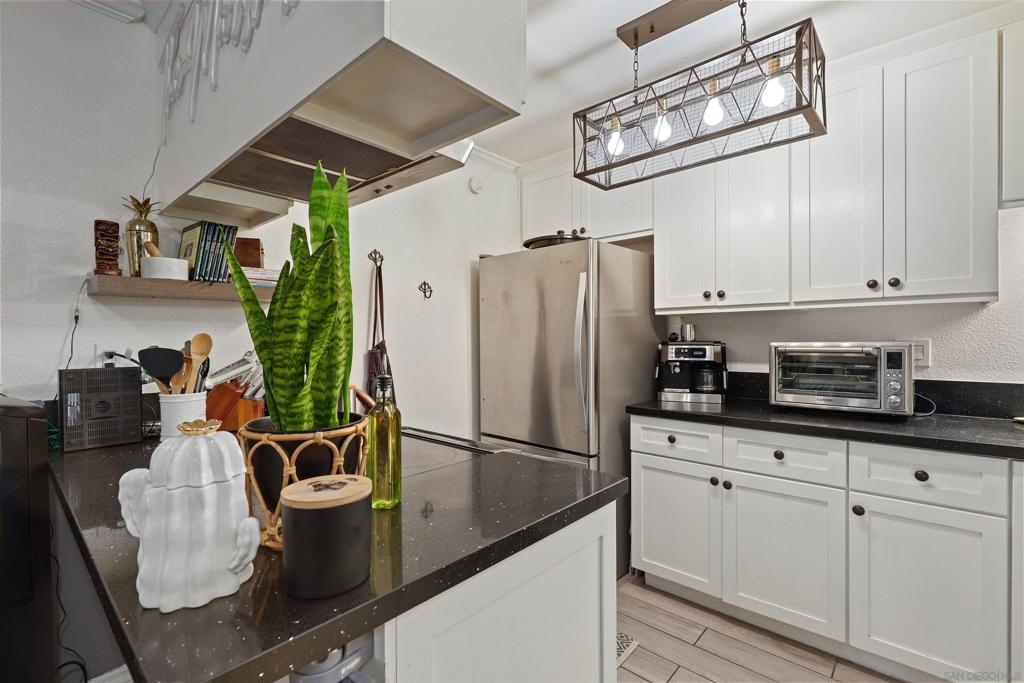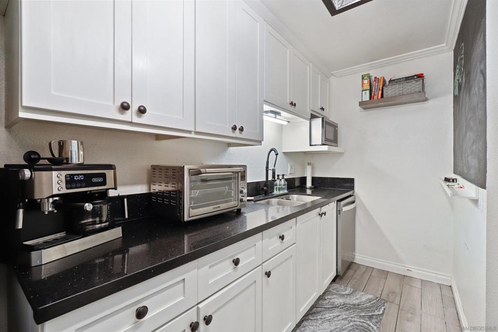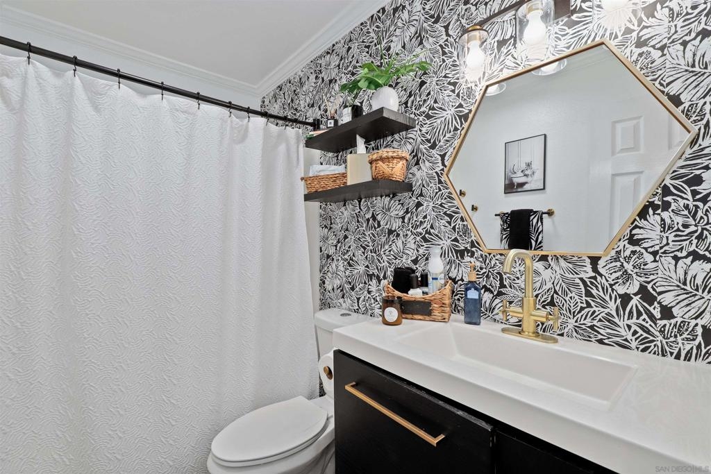 Quiet enjoyment awaits in this remodeled downstairs unit offering a private patio where you can enjoy the idyllic Carlsbad coastal climate all year long! An open concept living and dining area adorned with crown molding flows seamlessly into the kitchen. Updated in 2021, the kitchen features crisp white cabinetry, chic modern lighting, gorgeous countertops, and stainless steel appliances. New double pane windows and triple pane sliding glass door were also added in 2021. The bathroom was recently updated in 2023 with a designer’s flair, including floating shelves, decorative wall paper, modern lighting, vanity, mirror, and faucet. Two generously-sized bedrooms provide personal space for relaxation and solitude. The inside laundry cabinet accommodates a full-size stackable washer and dryer. Two assigned covered parking spots with an extra storage room (8.5' x 6.5') in the carport and additional guest parking available nearby. Located in the great Carlsbad School District, the Grove is a wonderful gated community offering its residents a sparkling pool, spa, clubhouse and tennis courts. Ideally located across from grocery stores, dining, shopping plus a half a block from The Shoppes at Carlsbad where you will find an abundance of entertainment venues, including a multi-screen movie theater, 24 Hour Fitness, Dave and Buster's, plus numerous eateries to suit your cravings and shops galore. You will be on your way to work with freeways only 2 blocks away. Close proximity to beaches in Carlsbad and Oceanside, this property has it all and is a must see!