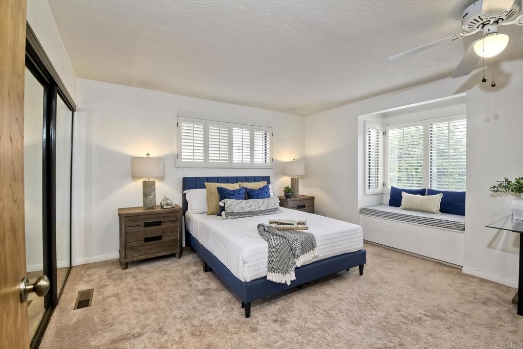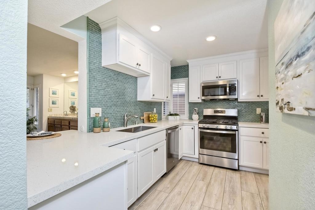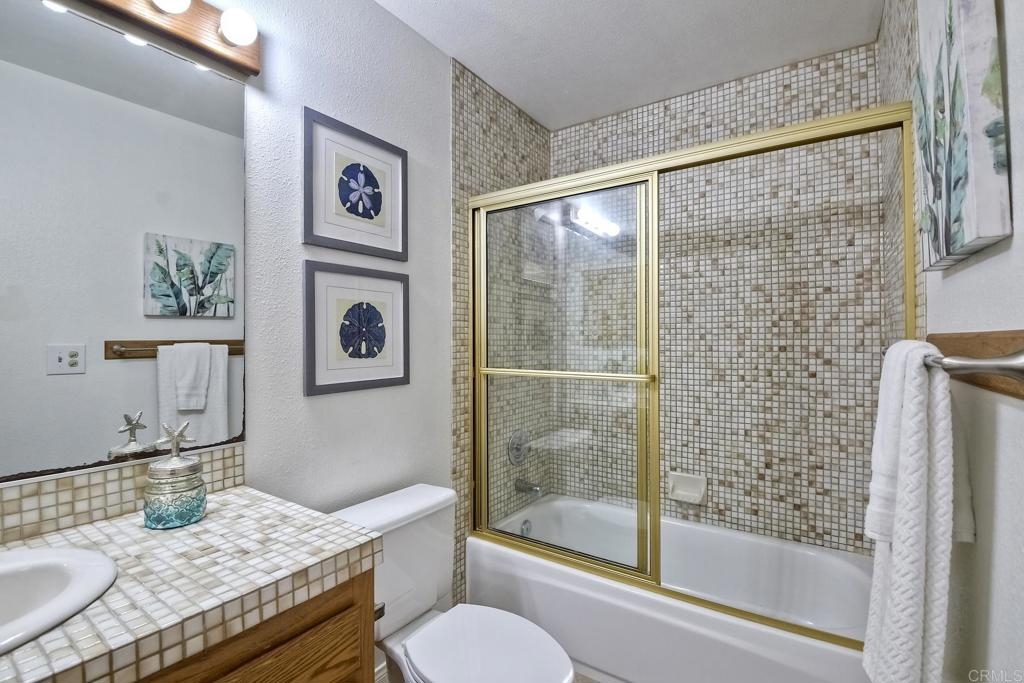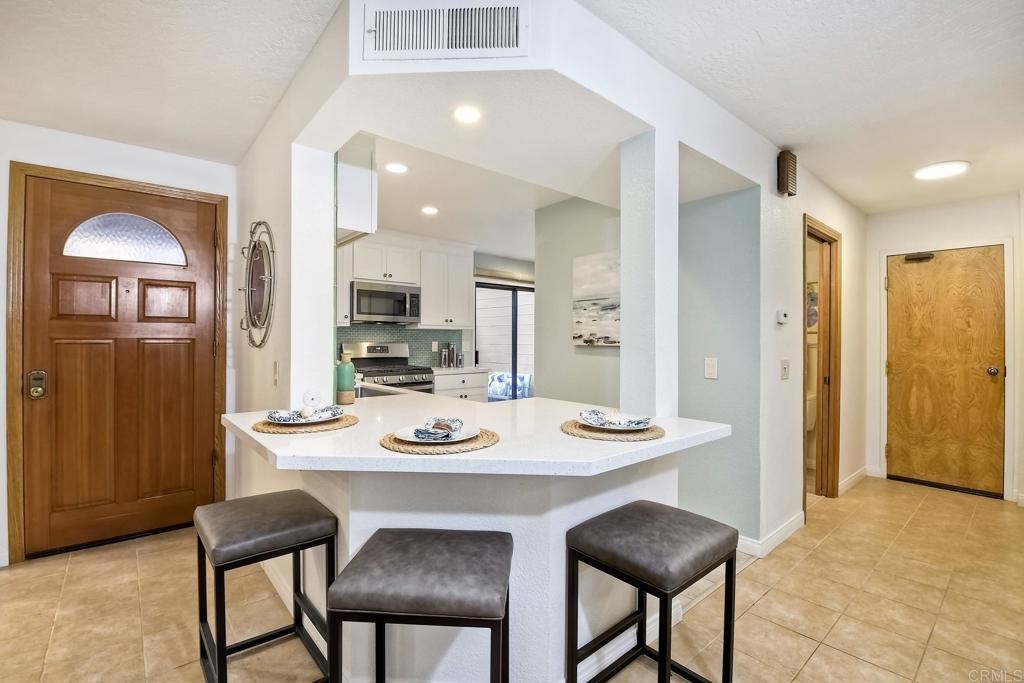 Lovely remodeled 2 bedroom/2.5 bath condo, with ATTACHED garage- WEST of the 5 in Old Carlsbad! Easy walk to the beach or Village! The kitchen has been beautifully remodeled featuring quartz counters, stainless appliances- including an undermount sink, luxury vinyl flooring, white wood cabinetry with fun "beachy" knobs, spacious eat-in bar space and convenient slider to the front courtyard patio! GROUND level entry is an added bonus and a remodeled half bath is downstairs as well! Enjoy the OPEN concept living space. The oversized wet bar is perfect for all your entertaining needs with plenty of storage below. The 2 bedrooms are upstairs and BOTH have their own baths! The primary bathroom is GORGEOUS- completely remodeled featuring quartz counters, double vanity with white wood cabinetry, OVERSIZED shower (6'X4') with rain showerhead & separate handheld shower wand, beach glass & subway tile design with bench and luxury vinyl flooring. Vinyl plantation shutters throughout. The community is gated and features a swimming pool & 2 spas.
