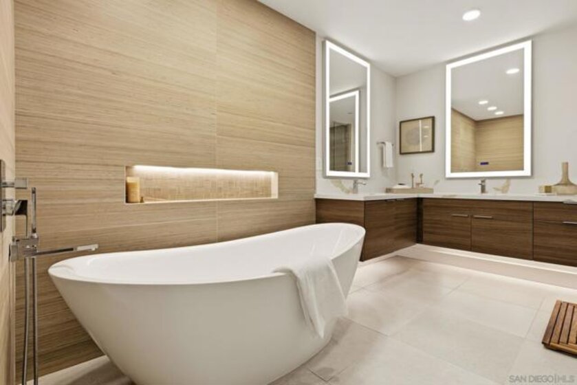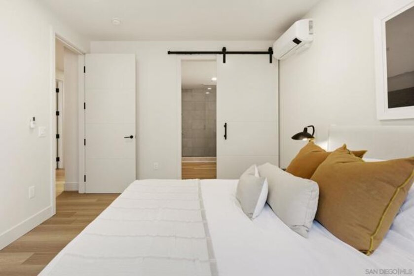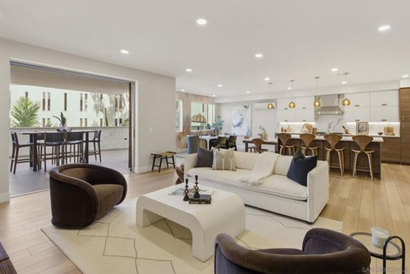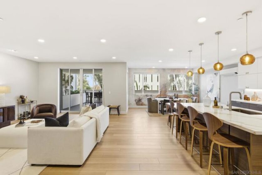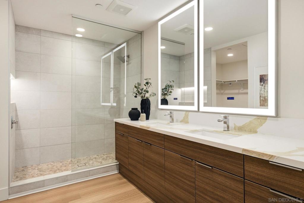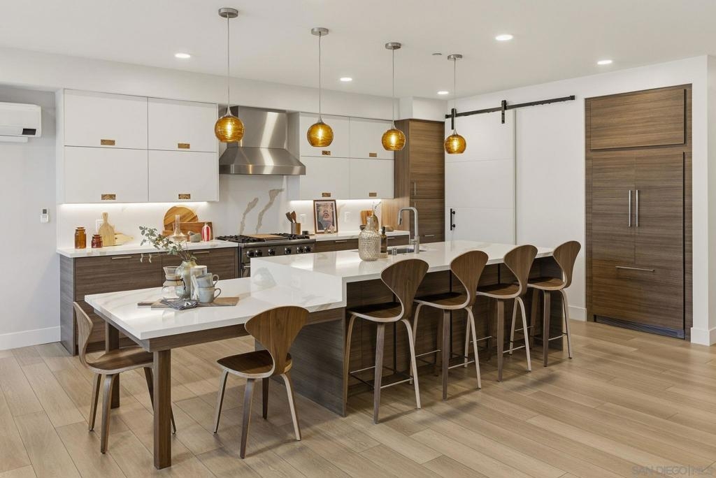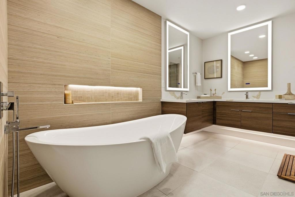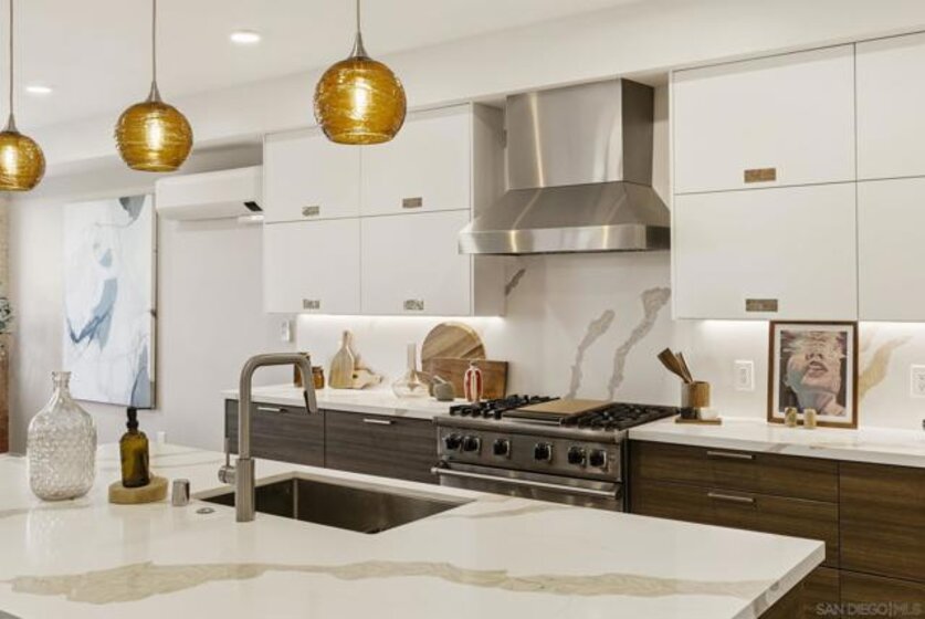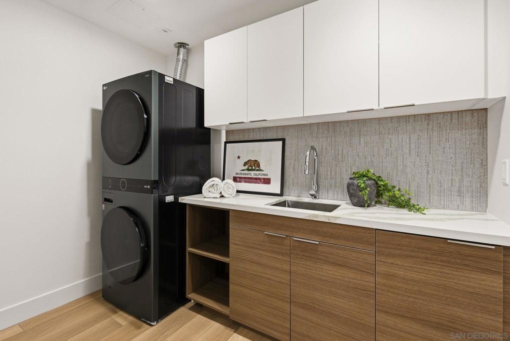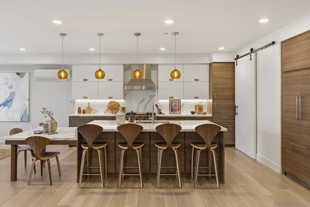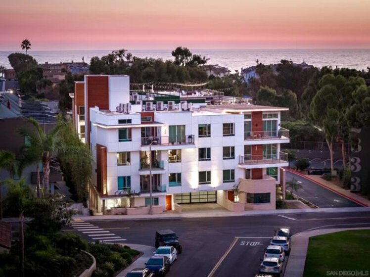 Experience the pinnacle of coastal luxury in this stunning 2024 built single-level condo, with ocean views, located within the highly sought after Ocean 17 community! Seamless indoor outdoor living is achieved through elegant sliding glass doors that open to a private patio with great lagoon views, and even peek ocean view, perfect for relaxing or entertaining. Step inside to discover an airy open concept layout enhanced by 9-foot ceilings, 8' solid core doors, custom cabinetry, and designer art lighting throughout. The chef’s kitchen is a true showpiece, featuring an oversized island, sleek quartz countertops, and premium Viking and Fisher & Paykel appliances, including a paneled refrigerator. A large pantry and full laundry room provide exceptional functionality, while generous closet space and additional storage ensure everything has its place. The primary suite is a serene retreat, designed with a spa inspired ambiance that includes a freestanding soaking tub, a large glass-enclosed shower, and refined finishes throughout. Ocean 17 offers an upscale lifestyle with amenities that include a beautiful lobby, elevator access, covered parking, and a stunning shared rooftop deck, an ideal setting to gather, unwind, and take in the coastal surroundings. Modern, luxurious, and perfectly positioned in Carlsbad Village, this exceptional residence truly defines elevated beachside living.