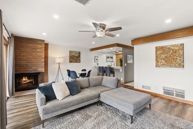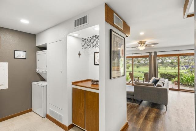 It’s truly just so good. This chic and sophisticated two-story end unit sits above the 16th hole of The Omni Resort’s “Legends” Golf Course, offering serene views from every room. Tucked into the lowest northeast corner of the complex, it’s one of only ten units that face the grassy edge along the course—providing a rare sense of spacious, peaceful privacy. Beyond the glowing stained glass window is a warm and inviting interior, brimming with artistic possibility. The main living area is anchored by a beautiful wood-burning fireplace adorned with adobe bricks—reminiscent of those commonly found throughout Mexico’s exquisite modern architecture. Two sliding glass doors create a wall of glass that opens out to the patio—perfect for al fresco dining or morning coffee with a view. Upstairs, the spacious, sunlit primary suite features a large picture window with a built-in bench, a sliding glass door to a private balcony, vaulted ceilings, a custom walk-in closet, a generous dressing area, and a large soaking tub. The guest bedroom is equally charming, with built-in cabinets and bookshelves, a convenient pull-down desk, and an enchanting loft. Located within the award-winning Encinitas Union School District and the San Dieguito Union High School District. The community features two tennis courts, a pool and spa. The unit includes one assigned parking space in the gated garage. Water and trash are covered by the HOA fees.