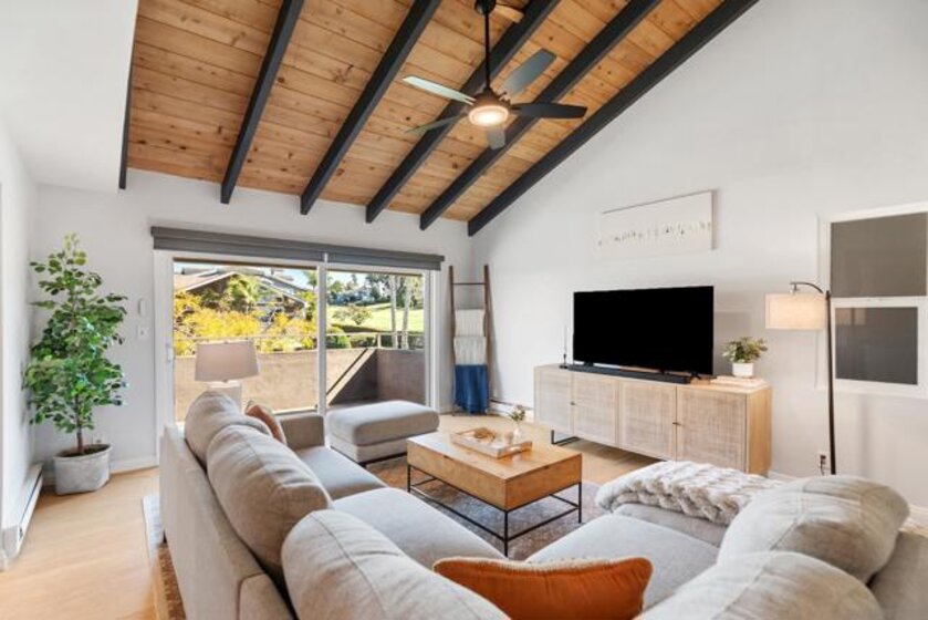 Picturesque La Costa retreat! Welcome to this beautifully upgraded home where every space has been brought to the most exacting of detail! This turnkey, upper level unit with vaulted beam ceilings frames a serene view of the World Famous La Costa Golf Course. Upgrades include a kitchen complete with beautiful natural granite counter tops, wood floors throughout and fully remodeled bathrooms complete with a custom walk in shower. The comforts of home also dazzle. A with full size stackable washer/dryer in the dedicated laundry closet, ample storage in hallway + oversized bedroom closet as well as additional space in assigned parking, storage provided is ample. New Dual pane vinyl windows throughout offer green energy efficiency and come with a transferrable lifetime warranty. The primary bedroom soaks in sunlight with large mirrored wardrobe doors, custom barn door to the en suite primary bath finished with a customized dual vanity. Enjoy evening walks throughout the lush green golf course, close proximity to shopping, Omni La Costa, restaurants and grocery or afternoons spent by the pool and the quality of life that only La Costa Carlsbad can offer!