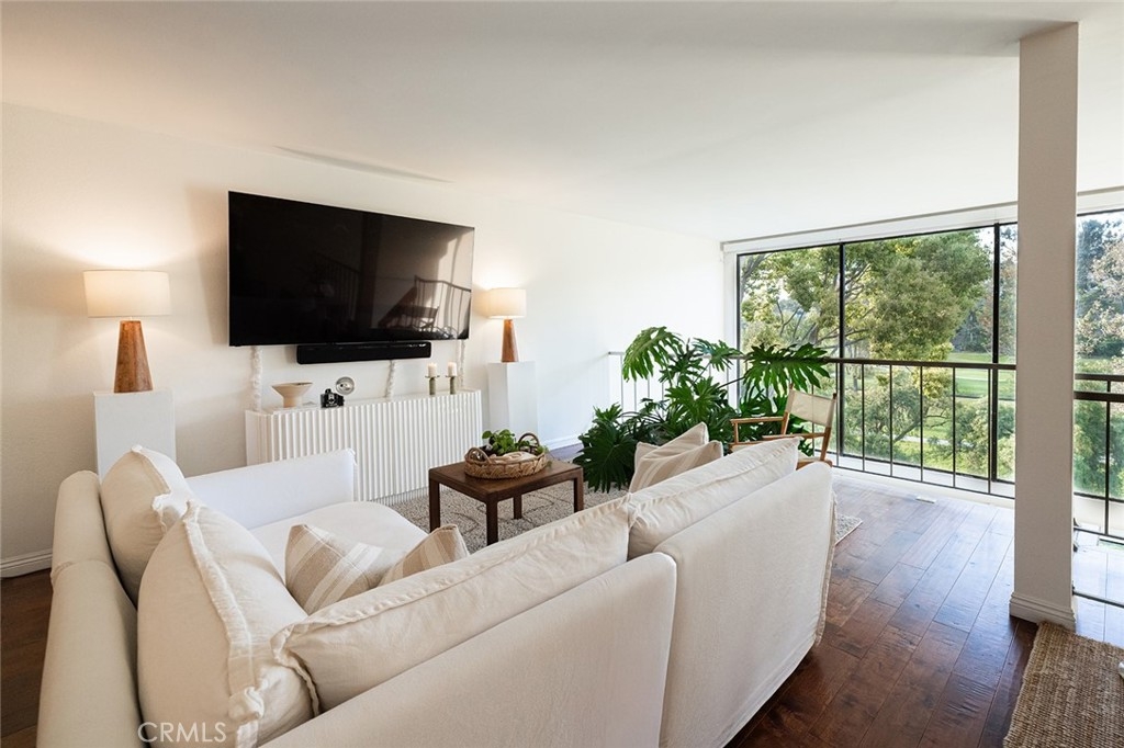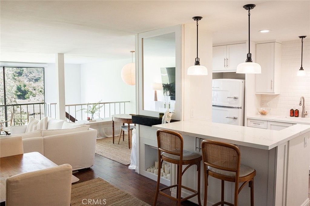 Discover the epitome of elegance in this stunning meticulously remodeled La Costa Cay home blending modern luxury with timeless charm. Floor to ceiling wall of oversized windows and sliding door create breathtaking golf course views. Step inside to an expansive open-concept living space, where new windows and an oversized slider flood the area with natural light, enhancing the exquisite wood floors that extend throughout. The kitchen is a masterpiece of design, featuring a quartz island and countertops, a stylish farm basin sink, charming vintage look refrigerator, Bosch dishwasher, electric range, sliding barn doors to pantry closet and curated lighting that highlights every detail. Large living area is currently configured with dining area in front of the kitchen island, living area with 75” included TV and convenient office space with striking sphere chandelier. Retreat to the primary bedroom offering serene comfort with new dual pane windows, plantation shutters and enhanced organization with custom closet systems. The ensuite bathroom is adorned with granite countertops and a sophisticated marble-look tiled primary shower/tub surround as well as marble look tile floors, adding a touch of spa-like luxury. Wood floors continue as you head downstairs to the 2nd bedroom space that is a great option for a gym or an office. Large closet, coffee/ wet bar and in unit laundry are on this level. This residence is equipped with all the modern conveniences, including central air conditioning, motorized shades on large windows, scraped ceilings, and new dual pane windows showcasing the tranquil views of the trees and golf course from your private balcony. Relax in your own oasis or in the community pool, hot tub and sauna. Additional amenities include a gated entry with keypad, convenient building elevator, covered garage with your reserved space, open guest parking, and included trash and water. Embrace a beach close coastal lifestyle of tranquility and elegance in this exquisite Carlsbad home, where every detail is crafted to perfection. Conveniently located 15 min from the beach and Batiquitos Lagoon, and nearby restaurants and shopping at multiple centers including The Beacon at La Costa. Welcome Home!