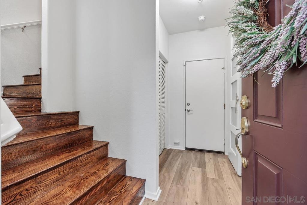 Beautiful light and bright corner unit in the Cascada complex of Rancho Carrillo! This tri-level home features 3 bedrooms + an opt office or guest suite. The first floor offers a versatile entry-level office or optional bedroom with a barn door closure, a laundry closet, and an attached two-car garage with epoxy flooring and ceiling storage racks. On the second floor, you will find an open-concept layout with LVP flooring, a spacious family room with a built-in entertainment center, a cozy fireplace, and a dining area. The updated kitchen showcases granite countertops, white cabinetry, and stainless steel appliances, leading out to a balcony with westerly sunset views. This level also includes one bedroom and a full guest bathroom. The top floor provides maximum privacy with a primary suite featuring a spa-inspired bathroom, built-in closet organization, and it's own balcony. The third bedroom also includes an ensuite bathroom. Additional highlights include fresh interior paint, a newer A/C unit (2024), security system, Ring doorbell, granite countertops in the bathrooms, and carpet overlaying the 2nd staircase. Residents of the Cascada community enjoy a private pool and spa, plus access to the Rancho Carrillo Swim Center’s year-round heated pool, clubhouse, and BBQ areas. The home is ideally located near Leo Carrillo Ranch, Legoland, Carlsbad beaches, and award winning SMUSD!