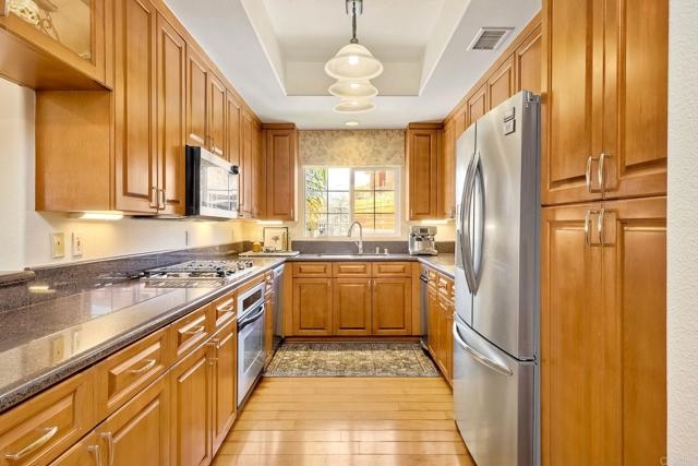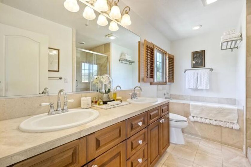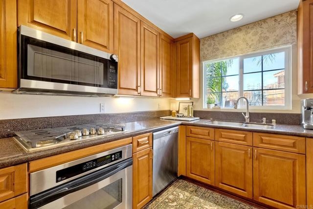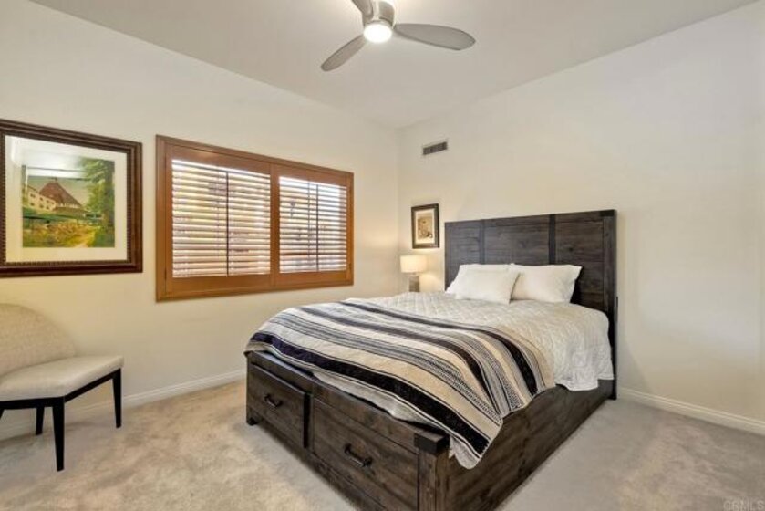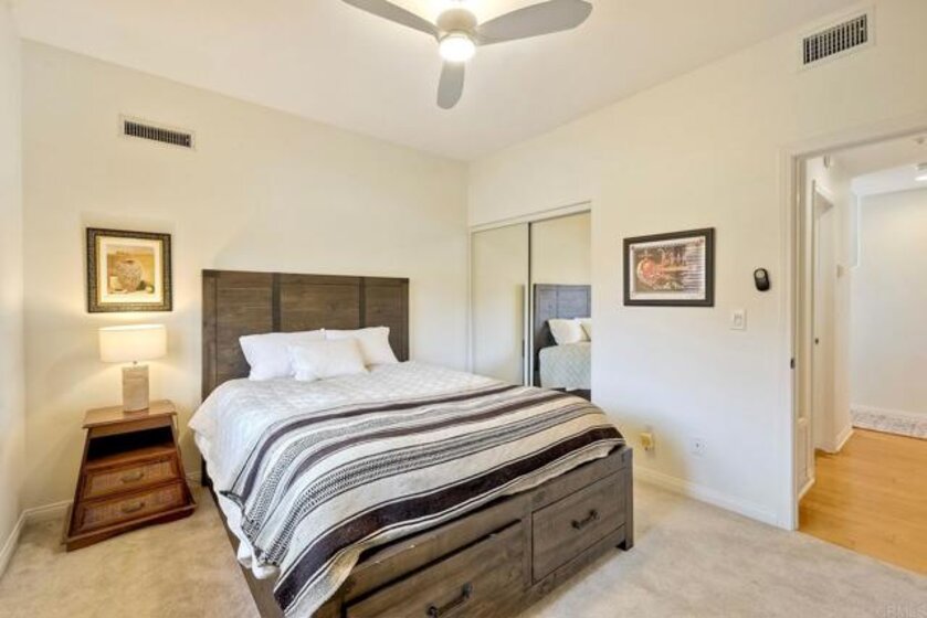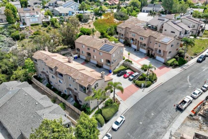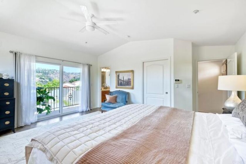 Your Coastal La Costa retreat awaits! End-unit immaculate townhouse. One full bed and bath on each of the three floors affords for exceptional privacy. Spacious top level primary suite features a view deck, dual bathroom sinks, custom travertine jacuzzi tub with enlarged stone shower and walk-in closet. Turnkey home has a wide-open living space with breakfast bar, windows on three sides, and a lovely balcony off the dining area. Beautiful wood flooring, plantation shutters and soaring high ceilings. Chef's kitchen with wood cabinets, granite counters, gas cooktop, and stainless-steel appliances. Large first floor ensuite bedroom and bathroom includes a walk-in closet. This meticulously maintained corner home enjoys an abundance of natural light and has only one attached wall, which was built to include extra sound proofing insulation. Central air conditioning and the HVAC unit has been updated. Direct secure access through the attached 2-car garage with epoxy flooring. Garage laundry area has a utility sink with extra storage. The Meadow View Townhomes includes total of 11 condominiums with low monthly HOA dues. Convenient location off La Costa Ave. Close to shopping, beaches, schools, hiking trails, restaurants and the world-famous Omni La Costa Golf Resort & Spa. Can come fully furnished per inventory list.